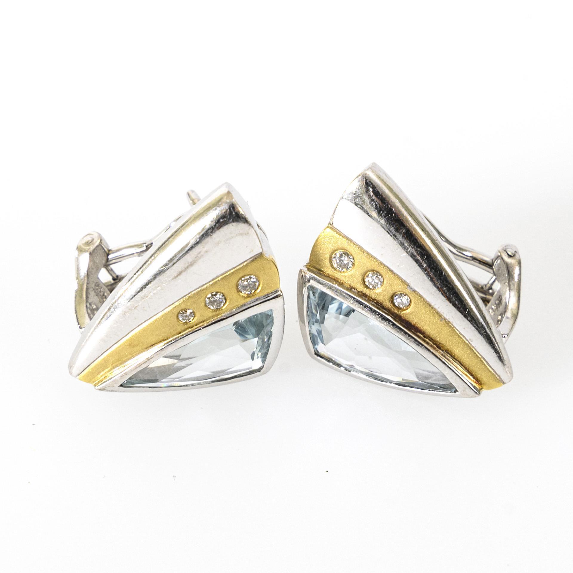 Modern gestaltete Bicolor-Clipstecker in gefächerter Dreiecksform mit je einem großen Aquamarin und drei Brillanten.