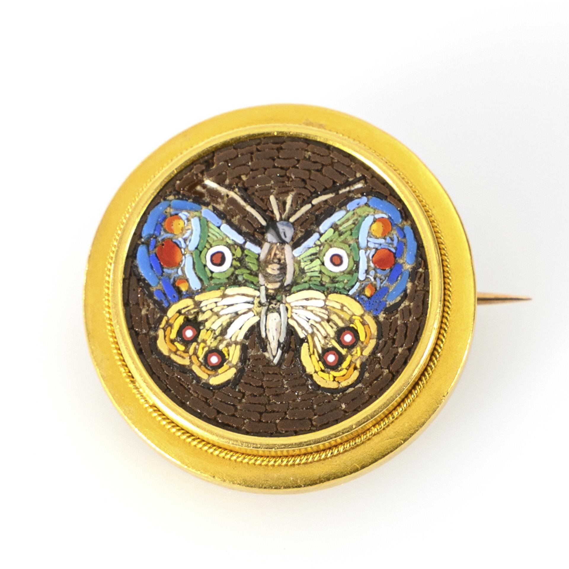 Historische Brosche mit Mikromosaik-Darstellung eines fantasiehaft gestalteten Schmetterlings. Nadel mit einfachem Hakenverschluss. Rückseitig Delle am Rahmen.