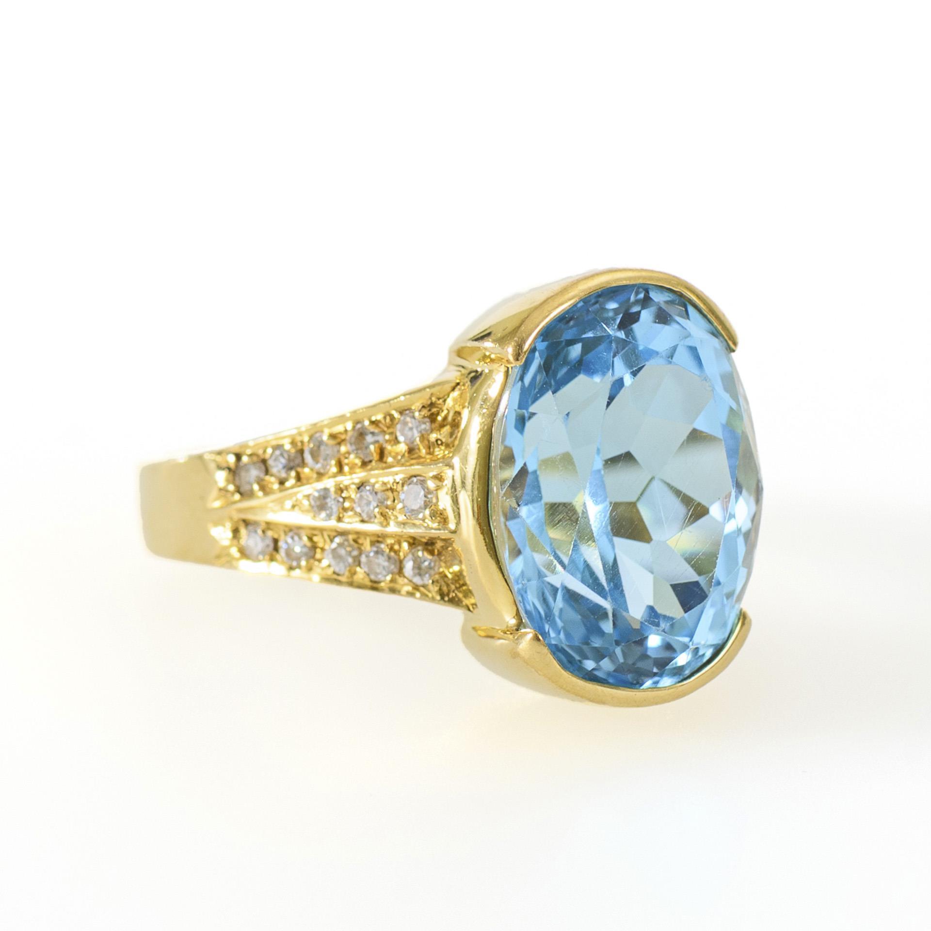 Ring mit großem behandelten blauen Topas, an den Ringschultern mit insgesamt 26 pavégefassten Brillanten besetzt.