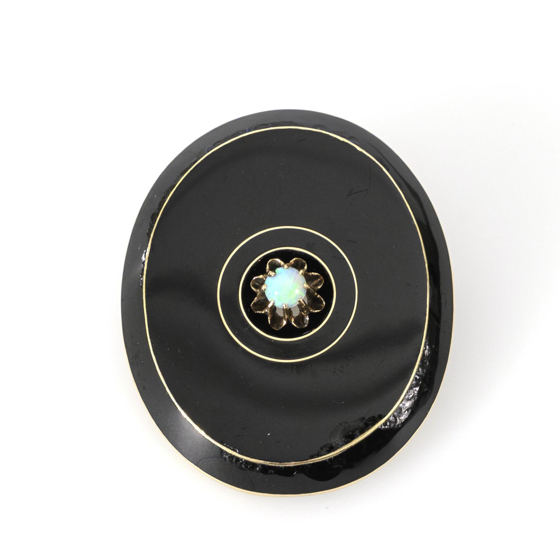 Schwarz emaillierte historische Anhänger-Brosche mit kleinem Opal, rückseitig mit ausklappbarem Haken. Wohl ursprünglich als Trauerschmuck getragen. Emaille mit deutlichen Bestoßungen, rückseitig Lötspuren, Haken der Broschierung wahrscheinlich in jüngerer Zeit erneuert.