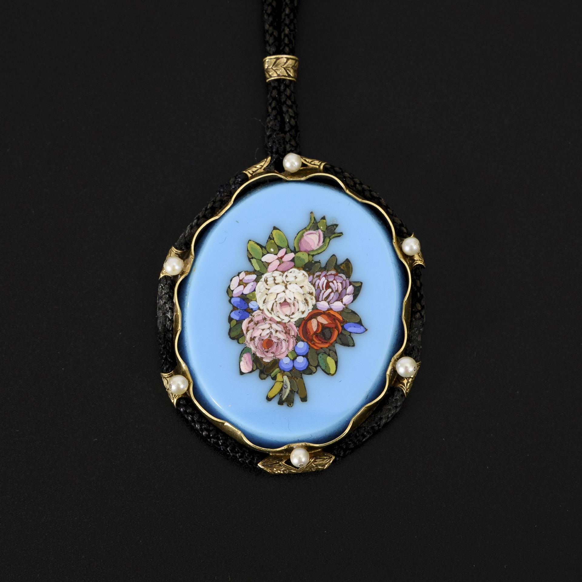 Florales Mikromosaik etwa des 3. Viertels des 19. Jahrhunderts mit Bouquet aus verschiedenfarbigen Rosen und Veilchen in Gold gefasst und von einer Kordelkette umrahmt, diese mit 6 perlenverzierten Elementen an der Fassung angebracht.