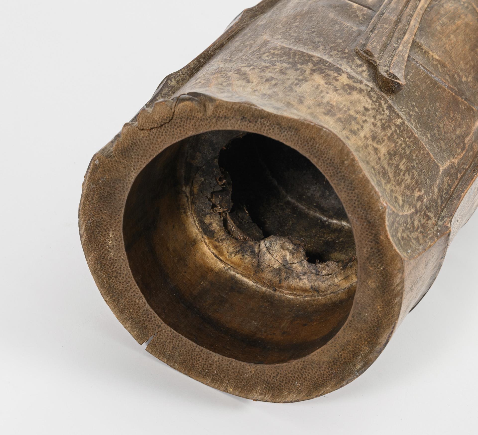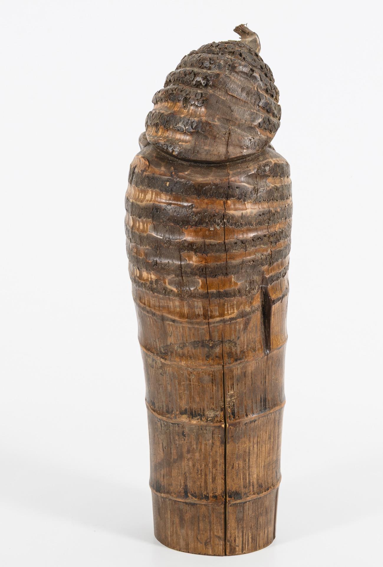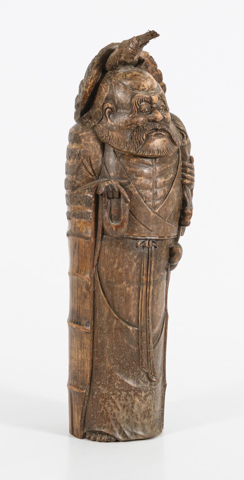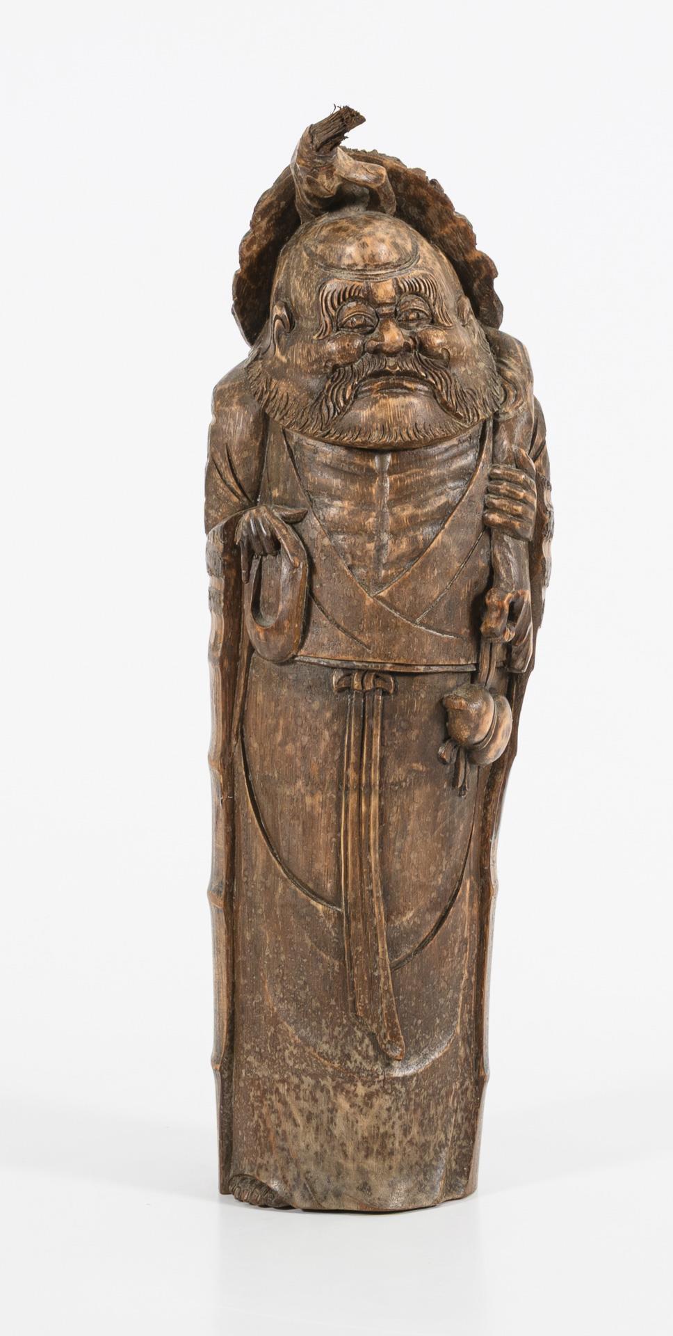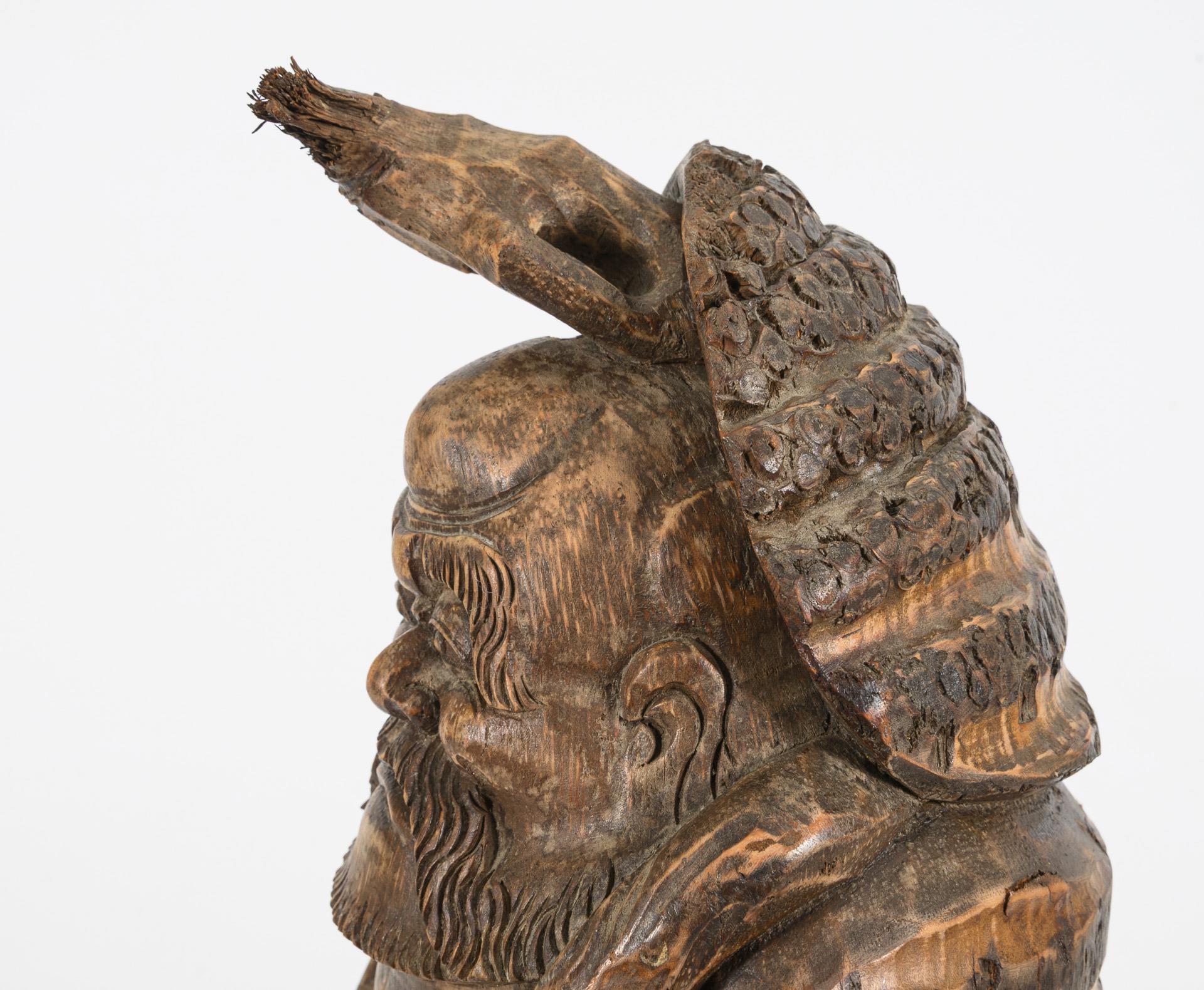 Darstellung einer mythologischen Figur. Als Attribute Stab mit Kürbisflasche, Beutel sowie großes Blatt als Kopfschutz und hervorstehende Brustrippen.