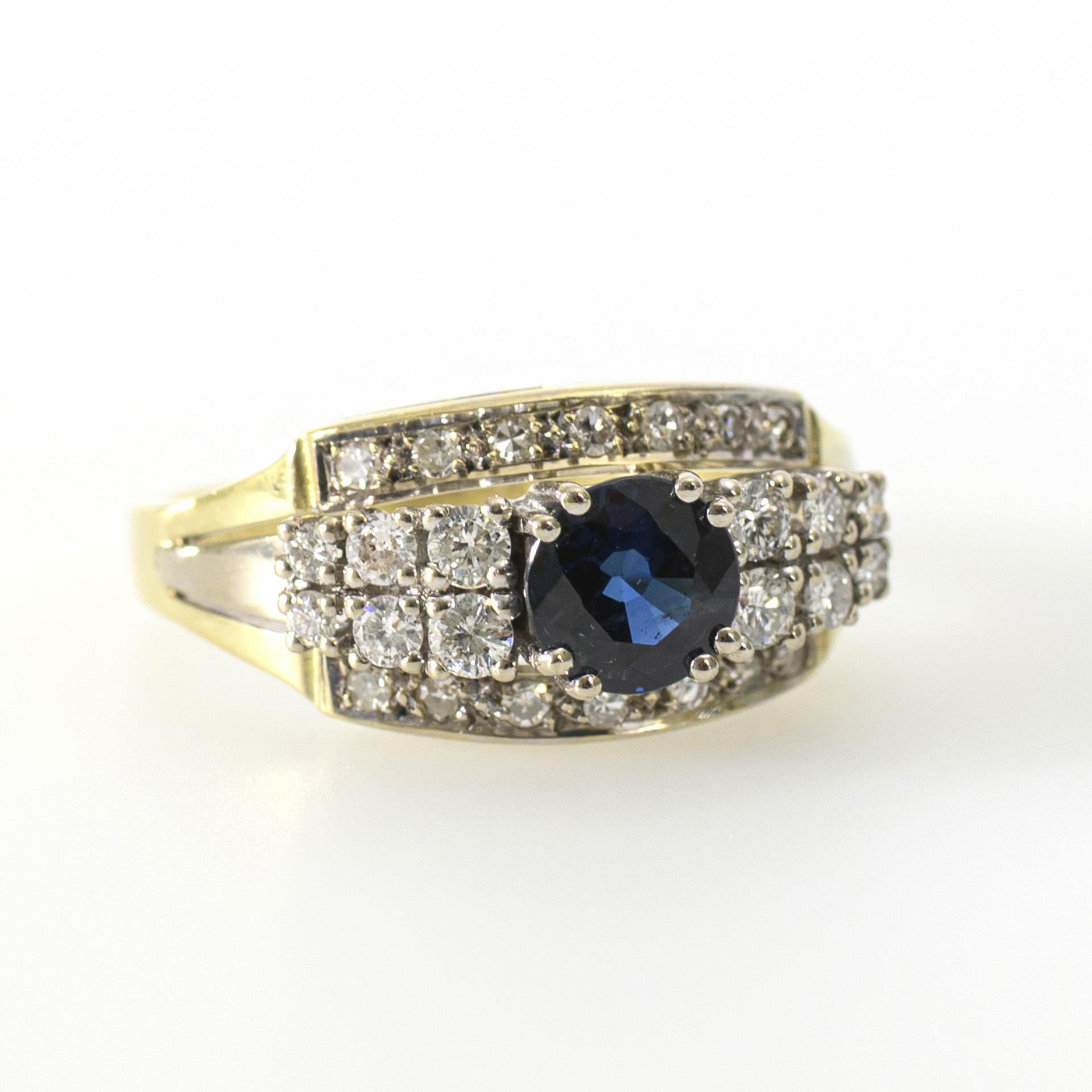 Zweifarbiger Ring mit breitem Ringkopf, dieser besetzt mit einem chatongefassten Saphir, seitlich umgeben von je 6 chatongefassten Brillanten zwischen einer mit kleinen pavégefassten Achtkantdiamanten teilbesetzten Ringschiene.