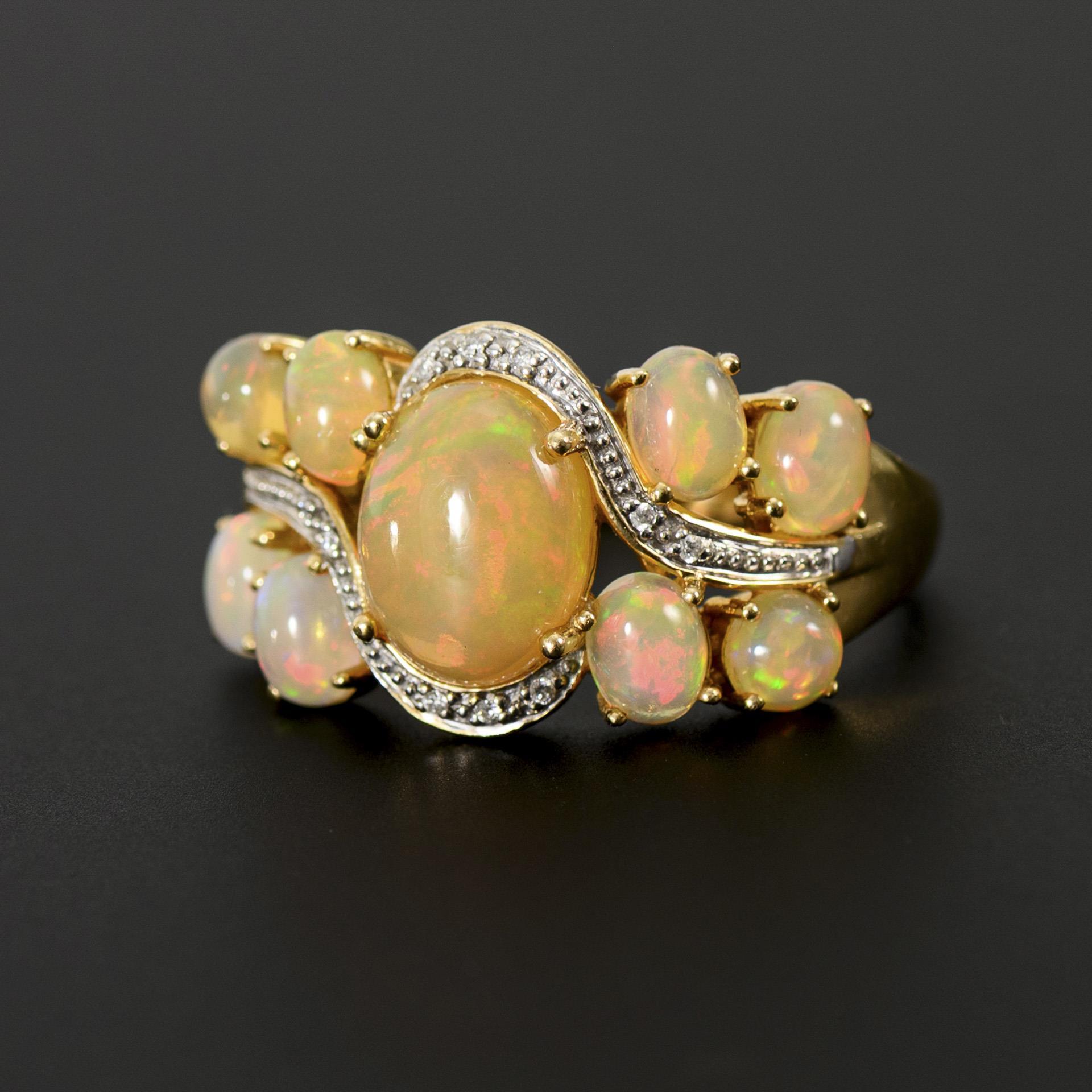 Breiter Ring mit 9 natürlichen Kristallopal-Cabochons und 10 kleinen Brillanten.