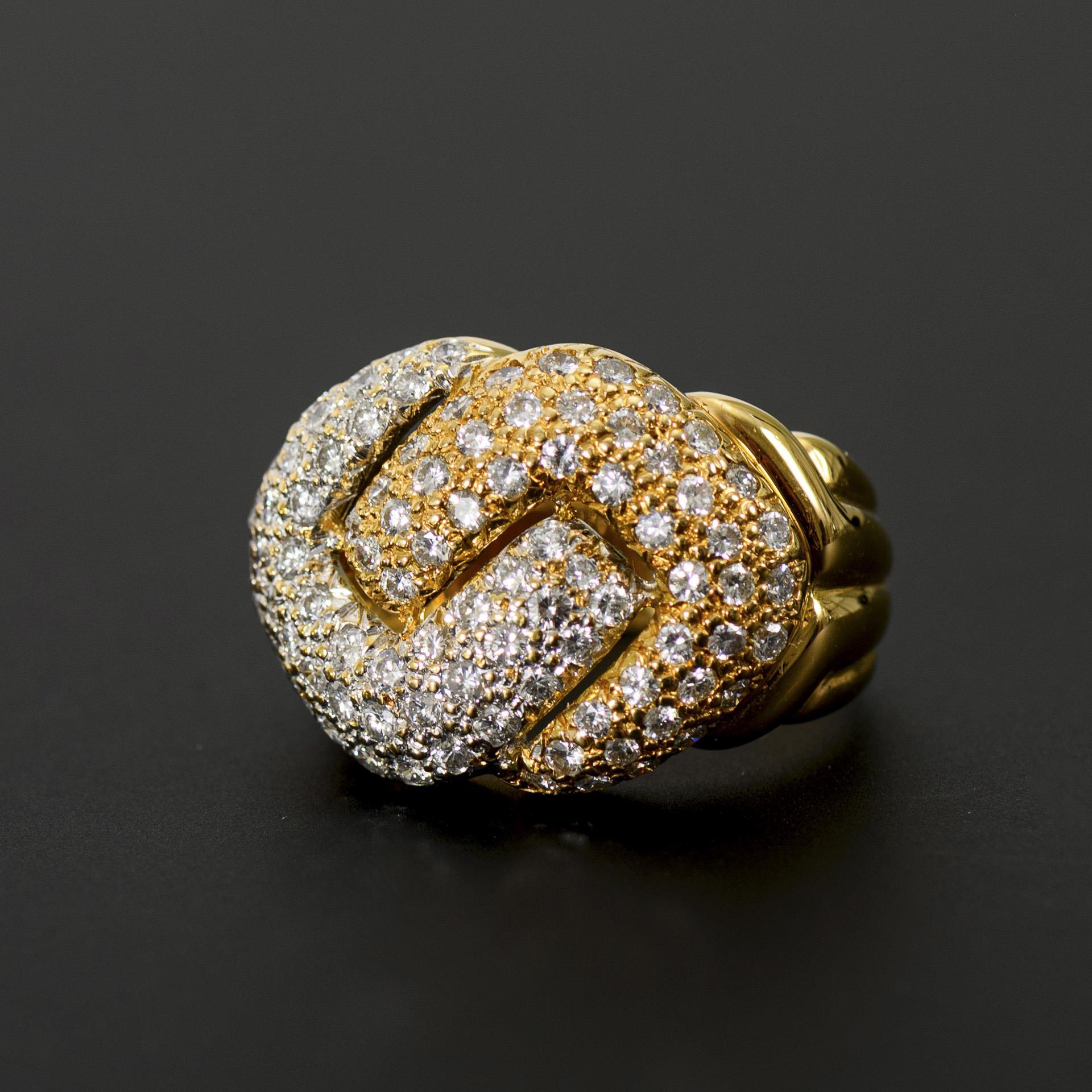 Bicolor gestalteter Ring mit großem, aus 2 verschlungenen Elementen gestaltetem Ringkopf mit Besatz aus 94 pavégefassten kleinen Brillanten leicht unterschiedlicher Größe.