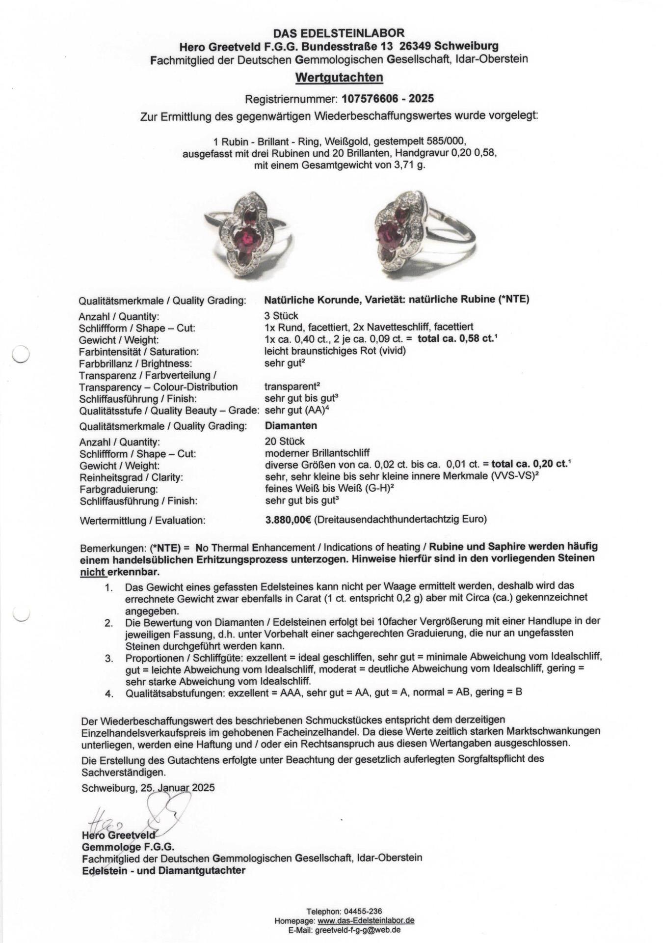 Weißgold 585 gestempelt. Ringgröße 48, die Rubine zusammen ca. 0,58 ct./vivid/AA, die Brillanten zusammen ca. 0,20 ct./VVS-VS/G-H. 3,71 g.