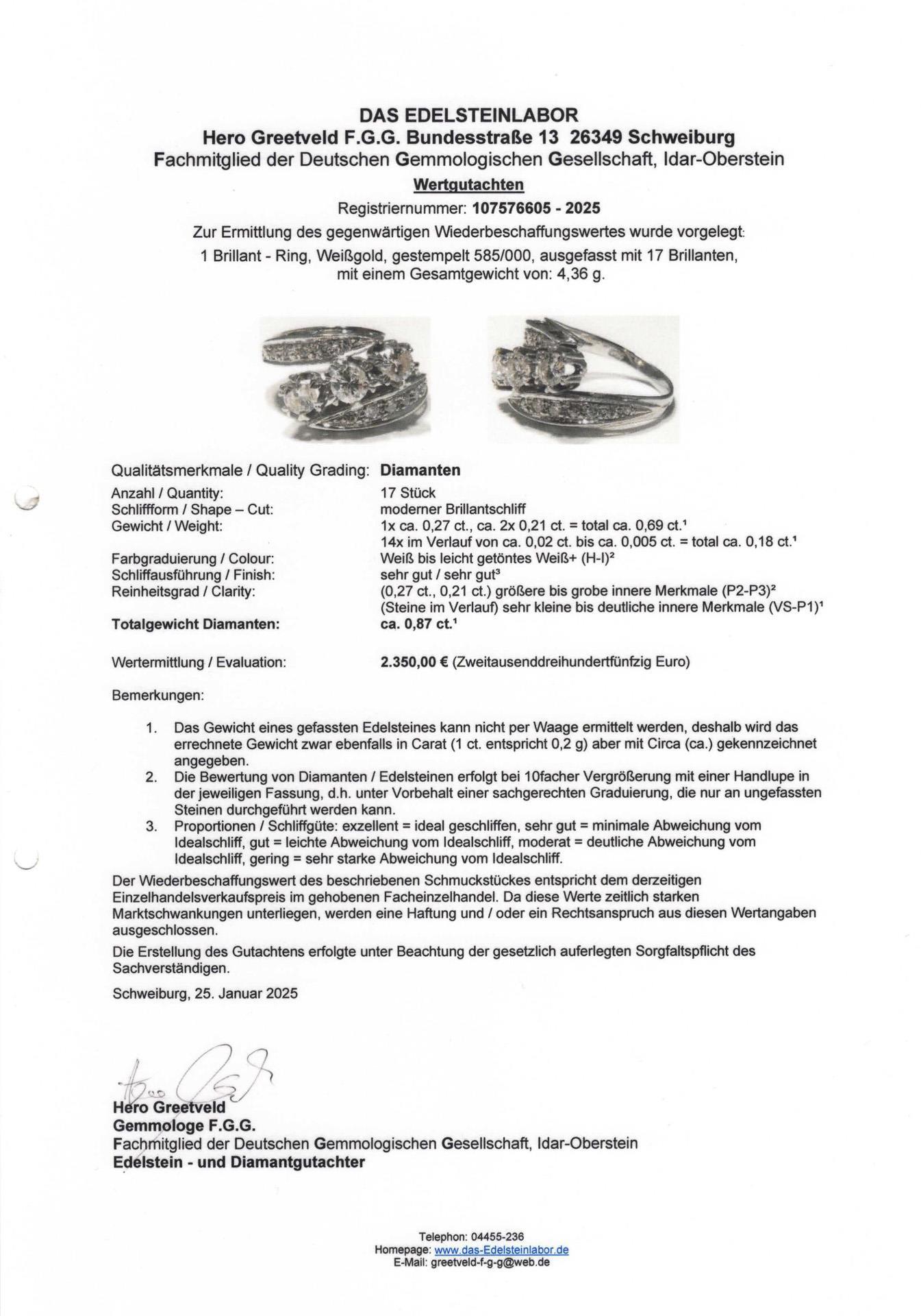 Weißgold 585 gestempelt. Ringgröße 54,5; Brillanten zusammen ca. 0,87 ct/H-I/2x P2-P3, der Rest VS-P1. 4,36 g.
