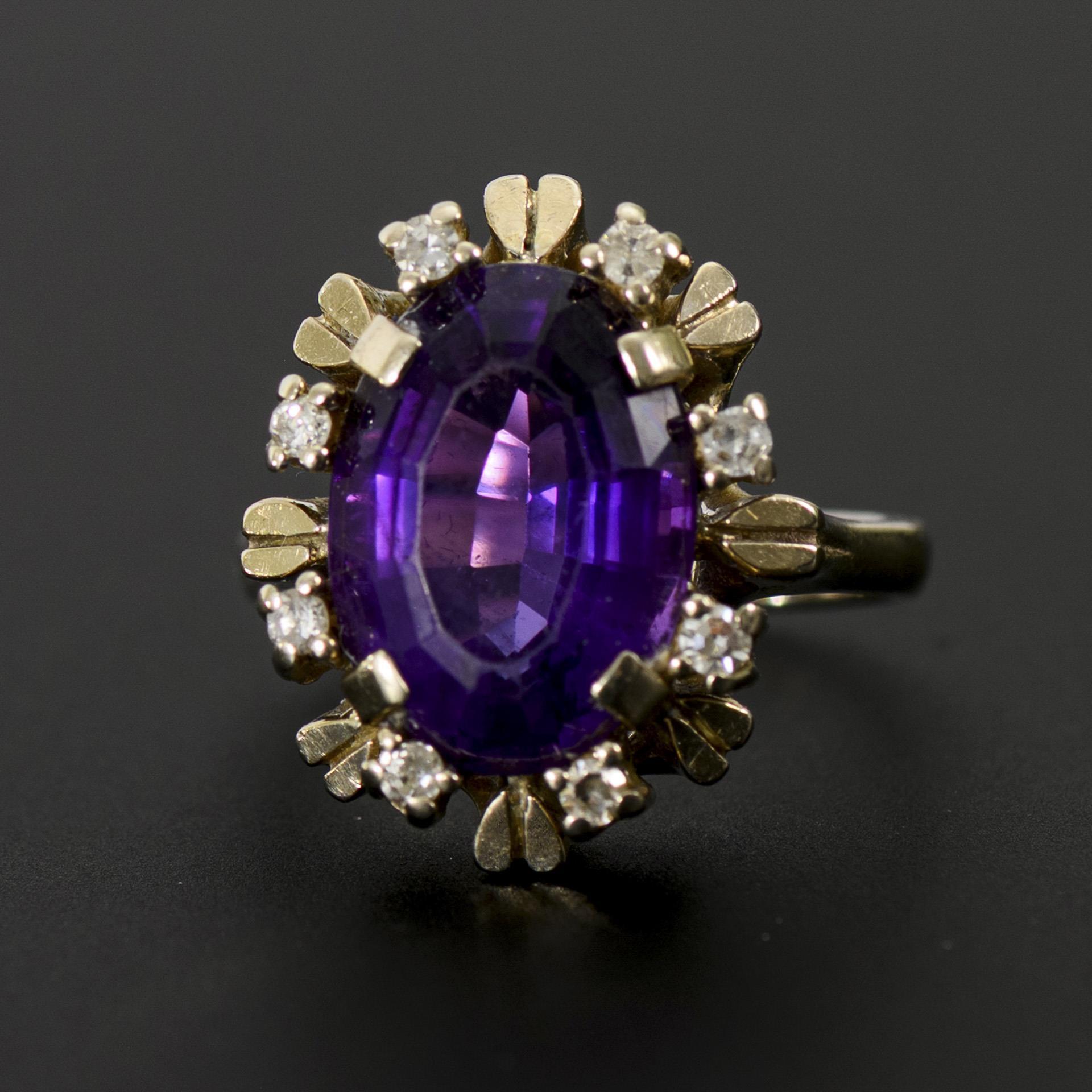 Moderner Ring mit großem, krappgefasstem Amethysten, umgeben von Zierelementen aus Weißgold und 8 kleinen Brillanten, an zarter Schiene. Leichte Tragespuren.