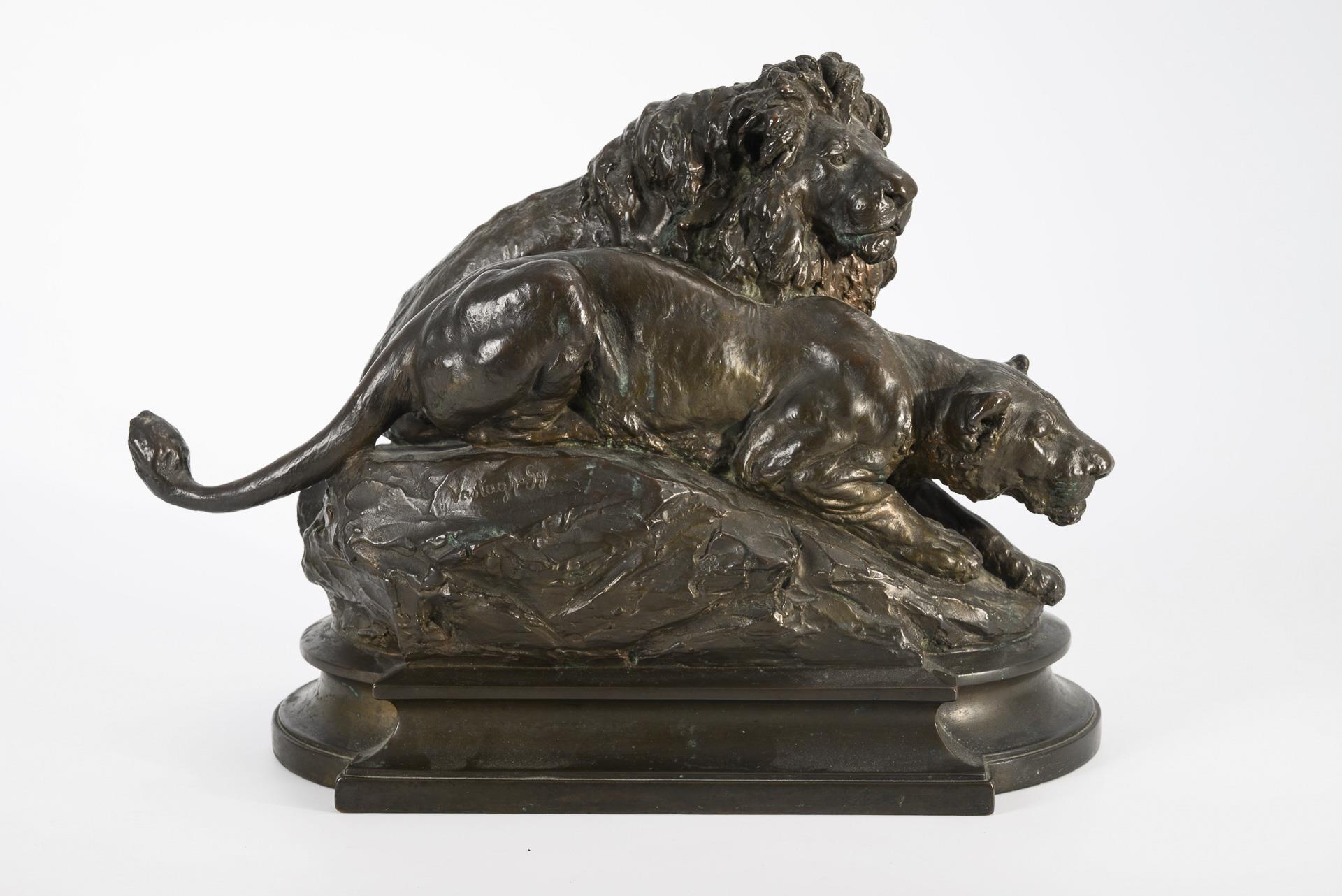 Realistische Darstellung des Löwenpaares auf einem Fels. Während der Löwe in die Ferne blickt, ist das Weibchen in Lauerstellung dargestellt. Patina minimal berieben.