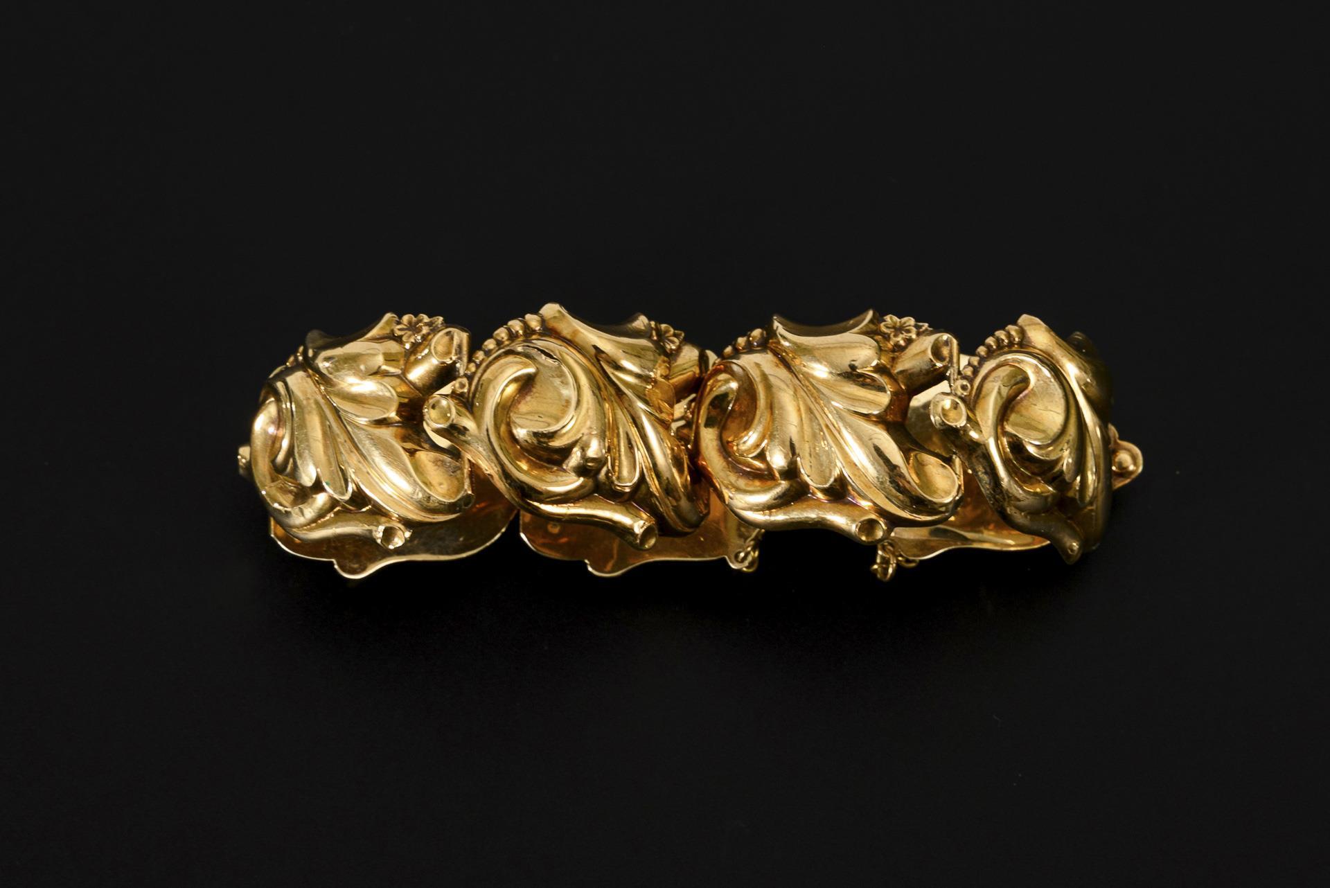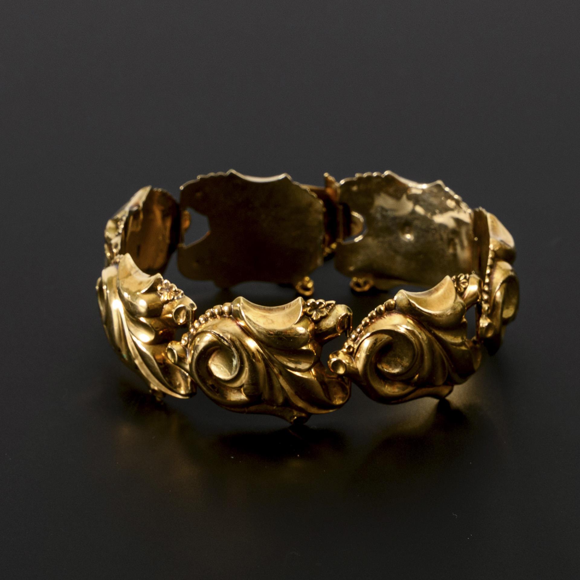 Biedermeier-Armband aus zeittypisch hohl gearbeiteten, innen unedel verstärktem Goldblech in vegetabil-floraler Ausgestaltung. In den Gesamtentwurf stimmig eingearbeitetes Kastenschloss mit Sicherheitskettchen. Altersgemäße Tragespuren; punktuell mit leichter Ablösung oder Verfärbung des Goldblechs (eine gut zu erkennende Fehlstelle: länge ca. 2,7 mm) und kleinen Dellen, z. T. innen, insgesamt diese nicht den Gesamteindruck beeinträchtigend.