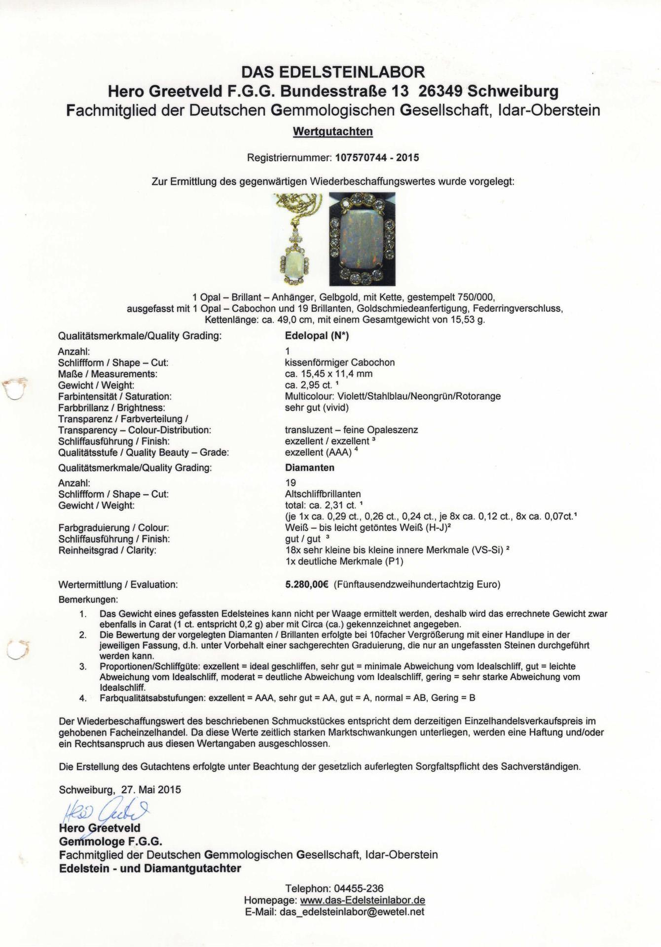 Gelbgold 750 gestempelt. Opal ca. 1,5 x 1,2 cm/ca. 2,95 ct/vivid/AAA, Altschliff-Brillanten zusammen ca. 2,31 ct/H-J/1x P1, die anderen VS-Si. 15,53 g.