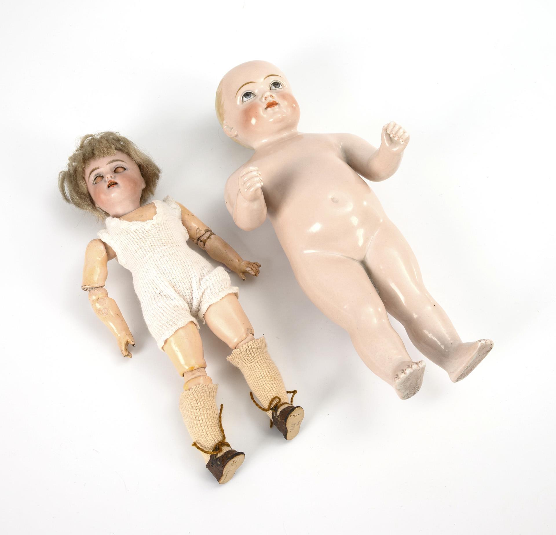 Kleine Gliederpuppe und Badepuppe.