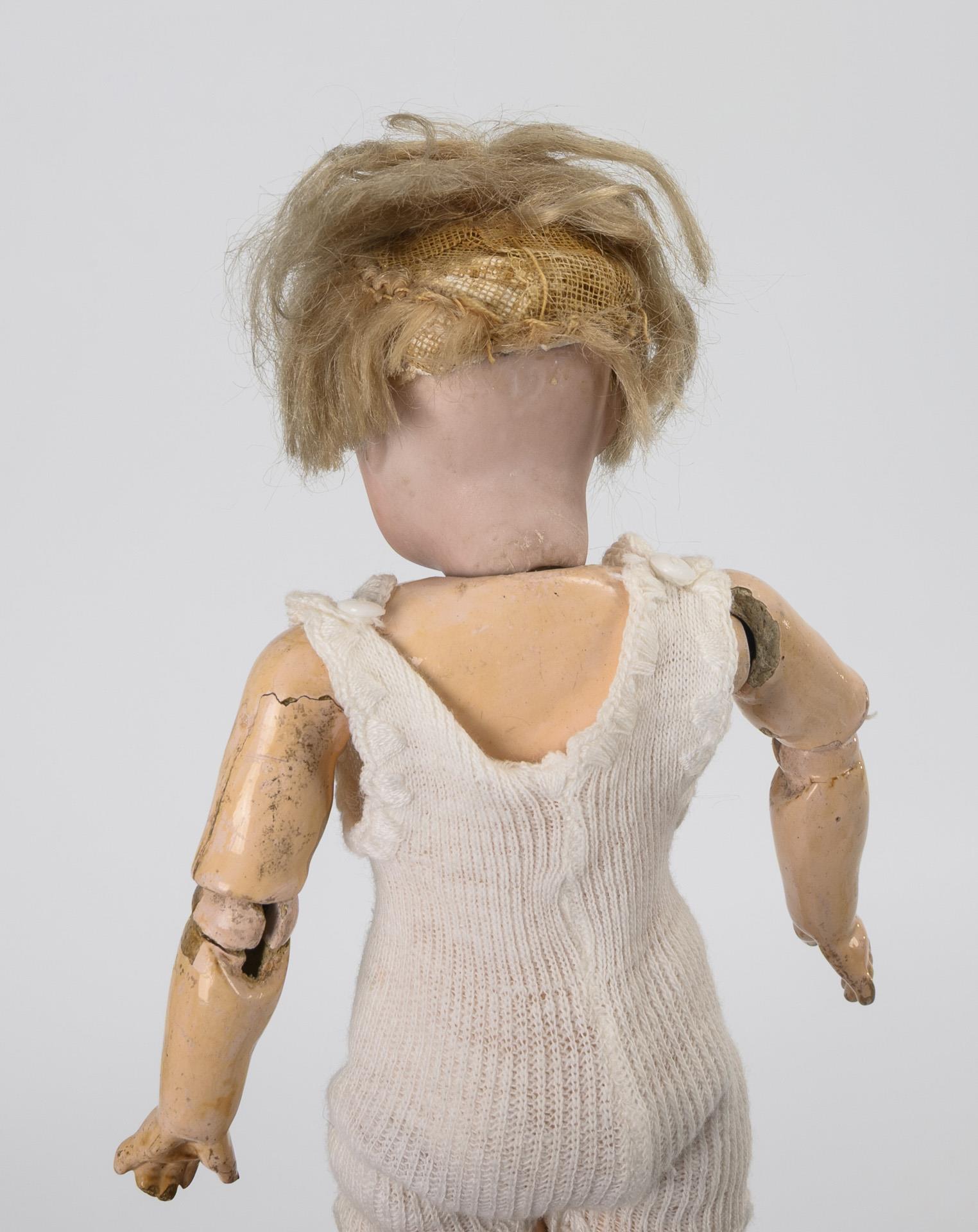 Zierliches Püppchen (undeutlich gemarkt) mit Kurbelkopf, braunen Schlafaugen, blonder Mohairperücke und 15-teiligem Gliederkörper in Unterwäsche. Körper mit kleinen Defekten (L 26 cm). / Blonder Nacktfrosch, sogenannte "Frozen Charlotte", mit gelbem Kleid (L 29 cm).