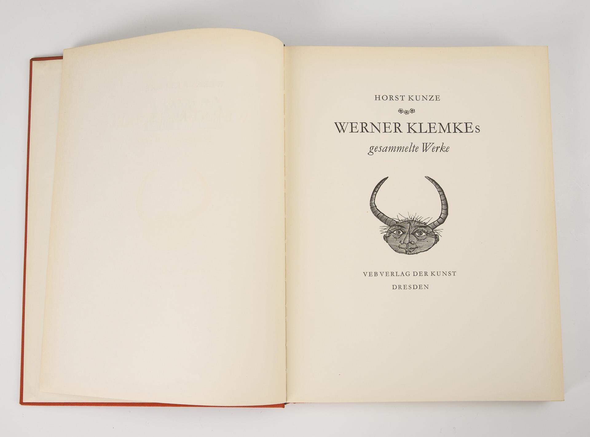 Buch: Horst Kunze: "Werner Klemkes gesammelte Werke", VEB Verlag der Kunst, Dresden 1968, 297 Seiten, im roten Leineneinband, 27,5 x 21 cm. / 12 kleine, auf Transparentpapier gedruckte Illustrationen zum 'Dekameron', davon 11 signiert. Jeweils 6 Arbeiten in einem Passpartout, rückseitig mit Tesafilm geklebt, und teils eingerissen, keine Bildbeeinträchtigung.