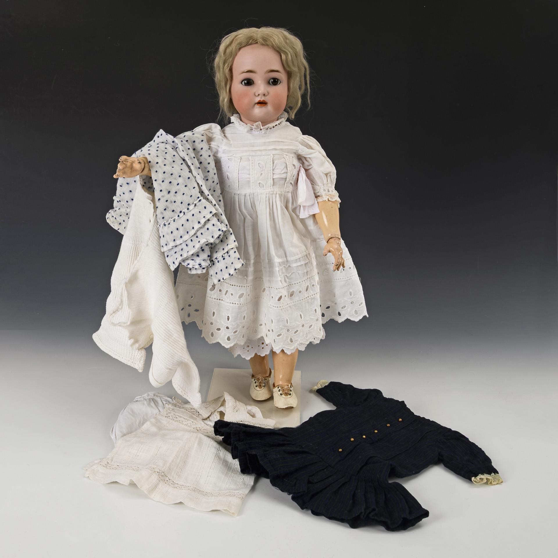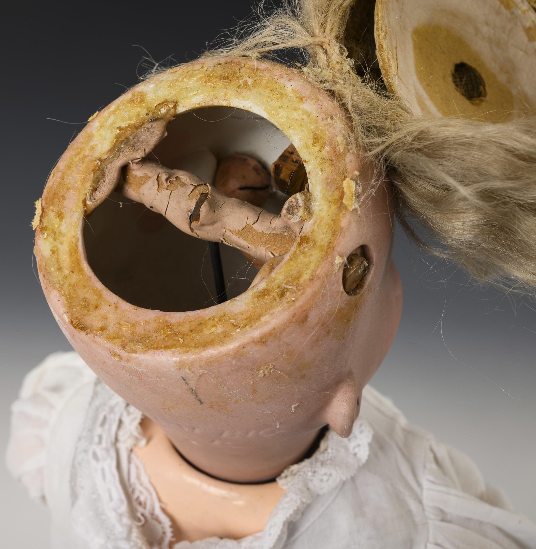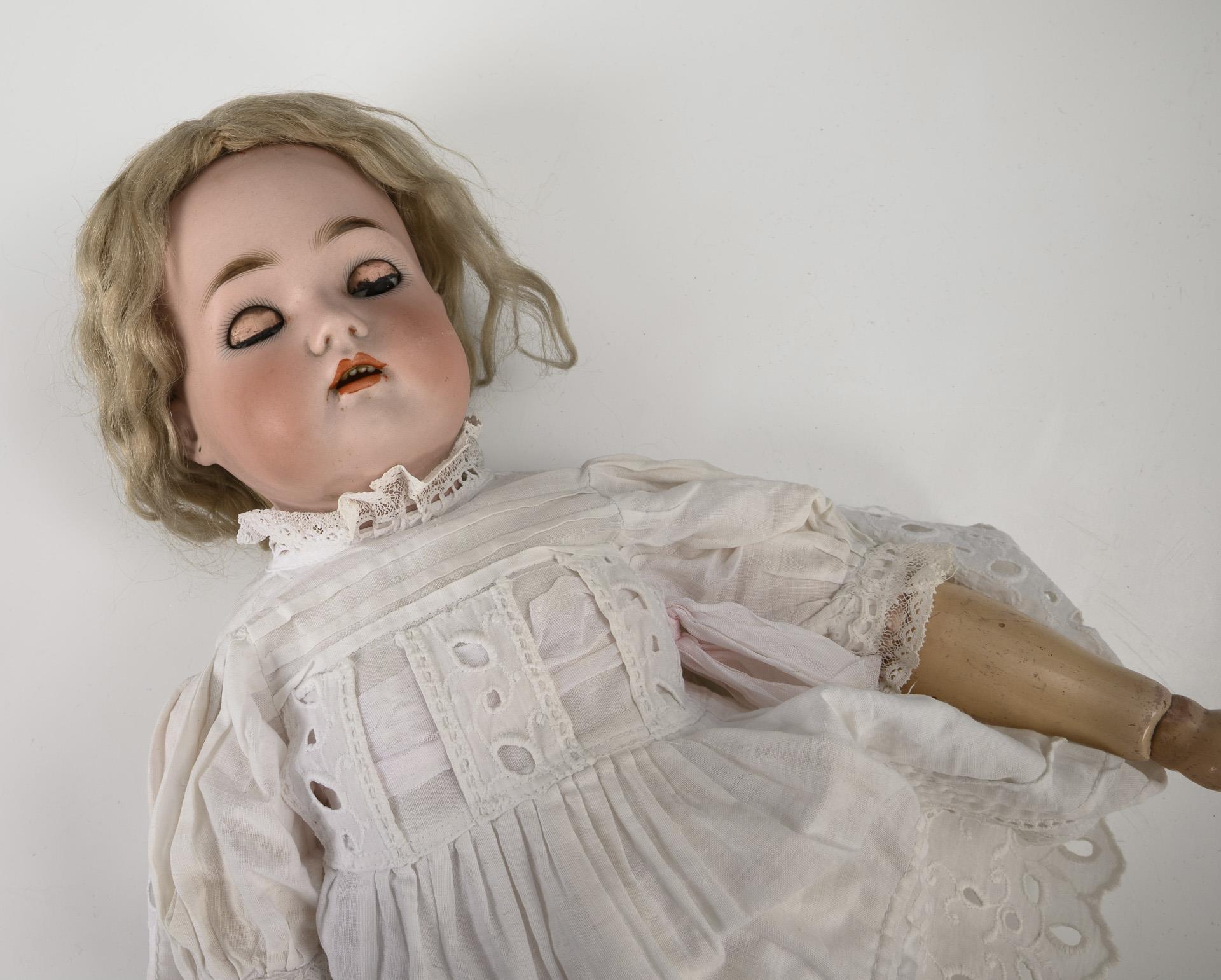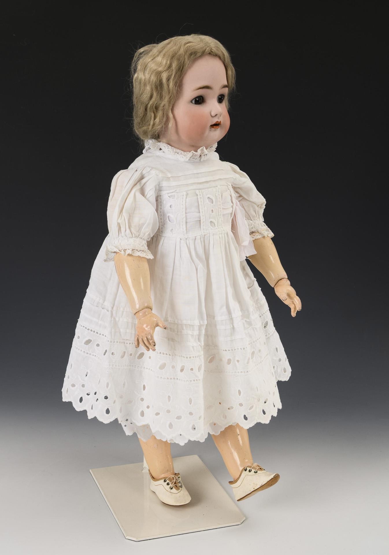 Kurbelkopf, braune Schlafaugen, Mohairperücke. 11-teiliger Laufpuppenkörper mit Gliederarmen, bei jedem Schritt dreht sich der Kopf hin- und her. Weißes Kleid mit Lochstickerei, weiße Lederschuhe. Dazu 2 Kleider, Schürze und 2 Teile alte Unterwäsche. Kopf durchleuchtet: ohne Defekte.