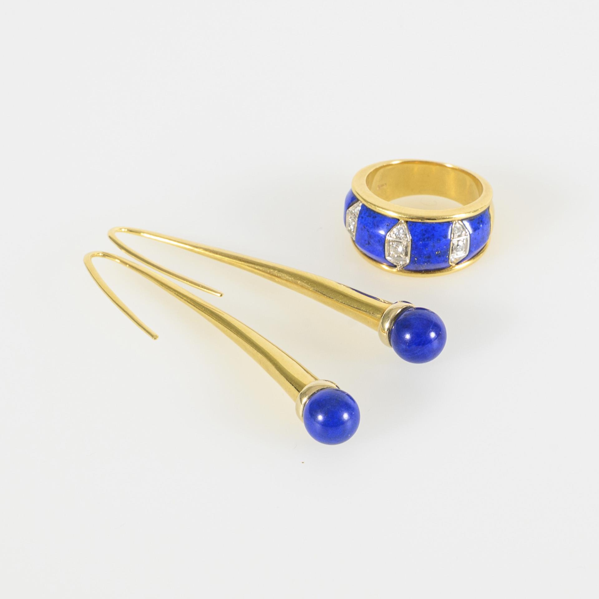Set bestehend aus langen Ohrhaken und einem Ring in zweifarbigem Gold mit Lapislazuli, der Ring zusätzlich mit 9 Brillanten besetzt. Ring unterseitig mit Tragespuren.