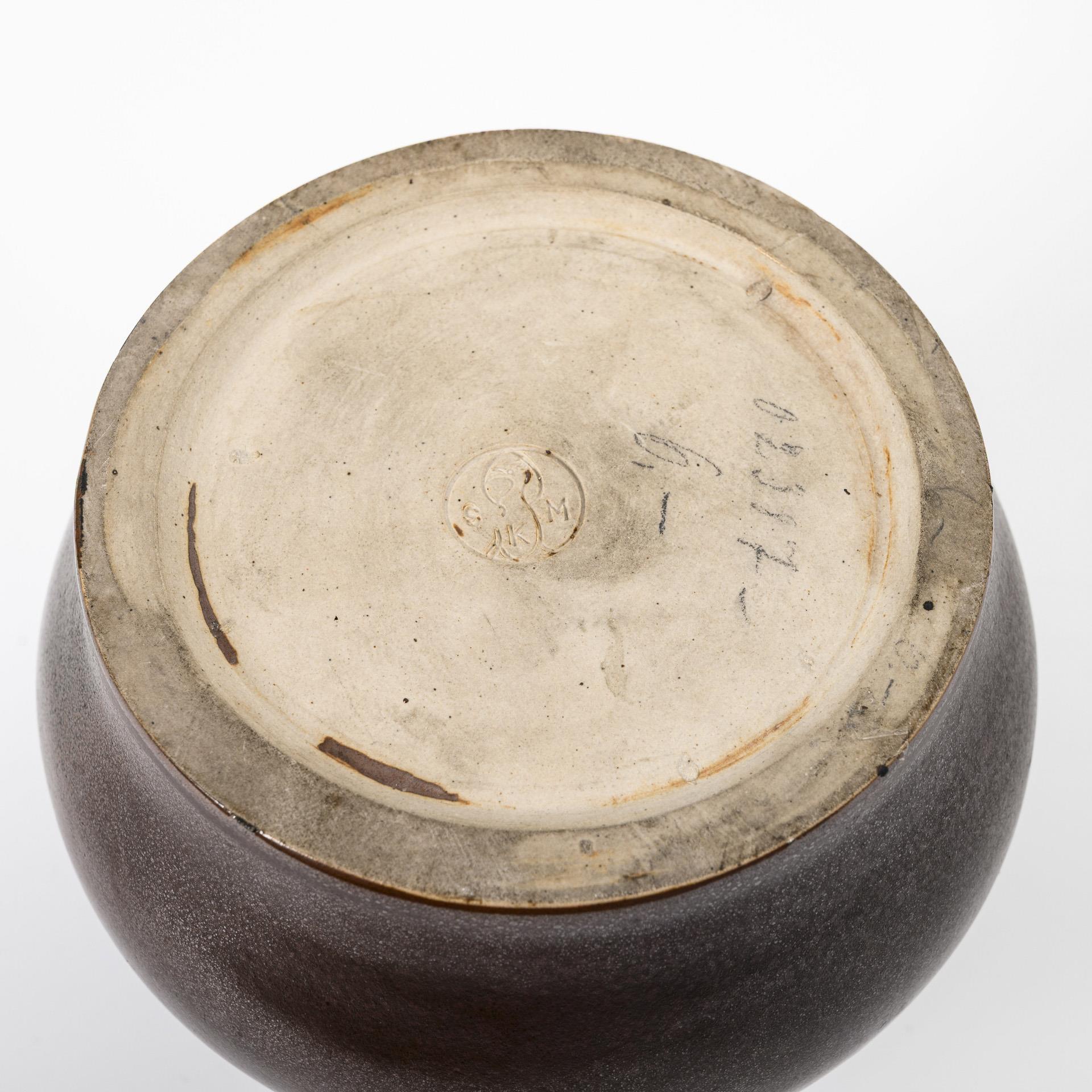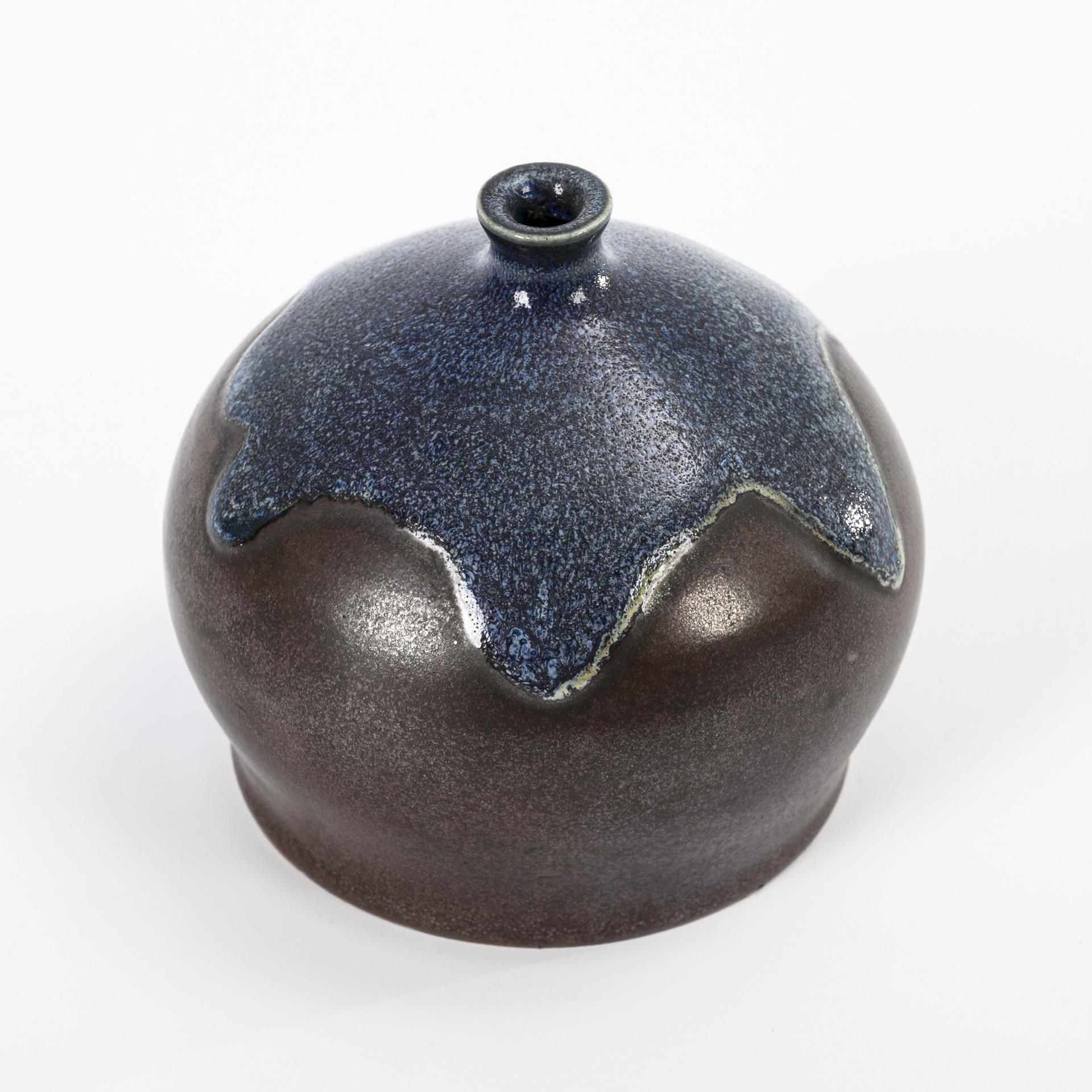 Steinzeug, brauner Fond, blau und weiß glasiert. H ca. 12 cm. 861 g.