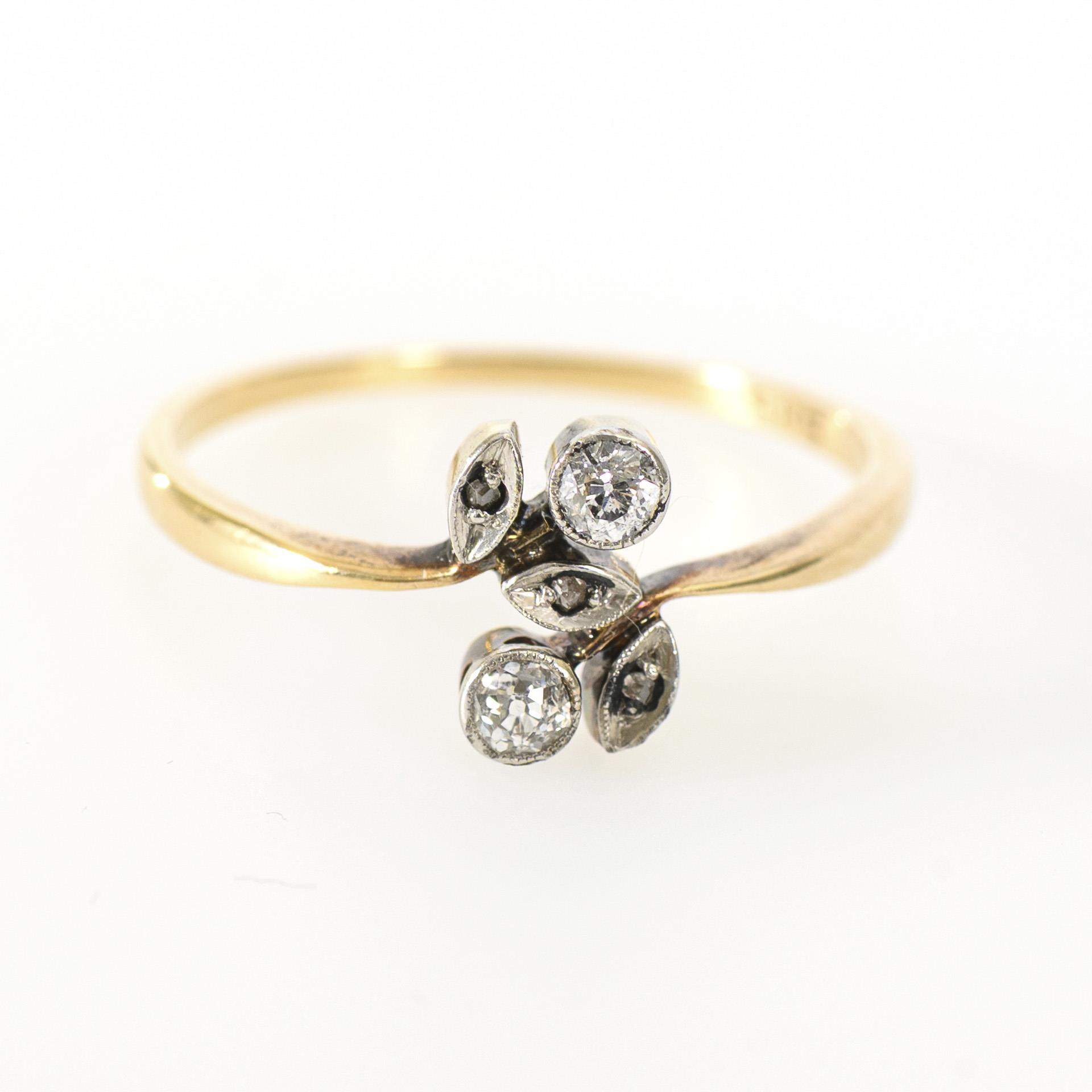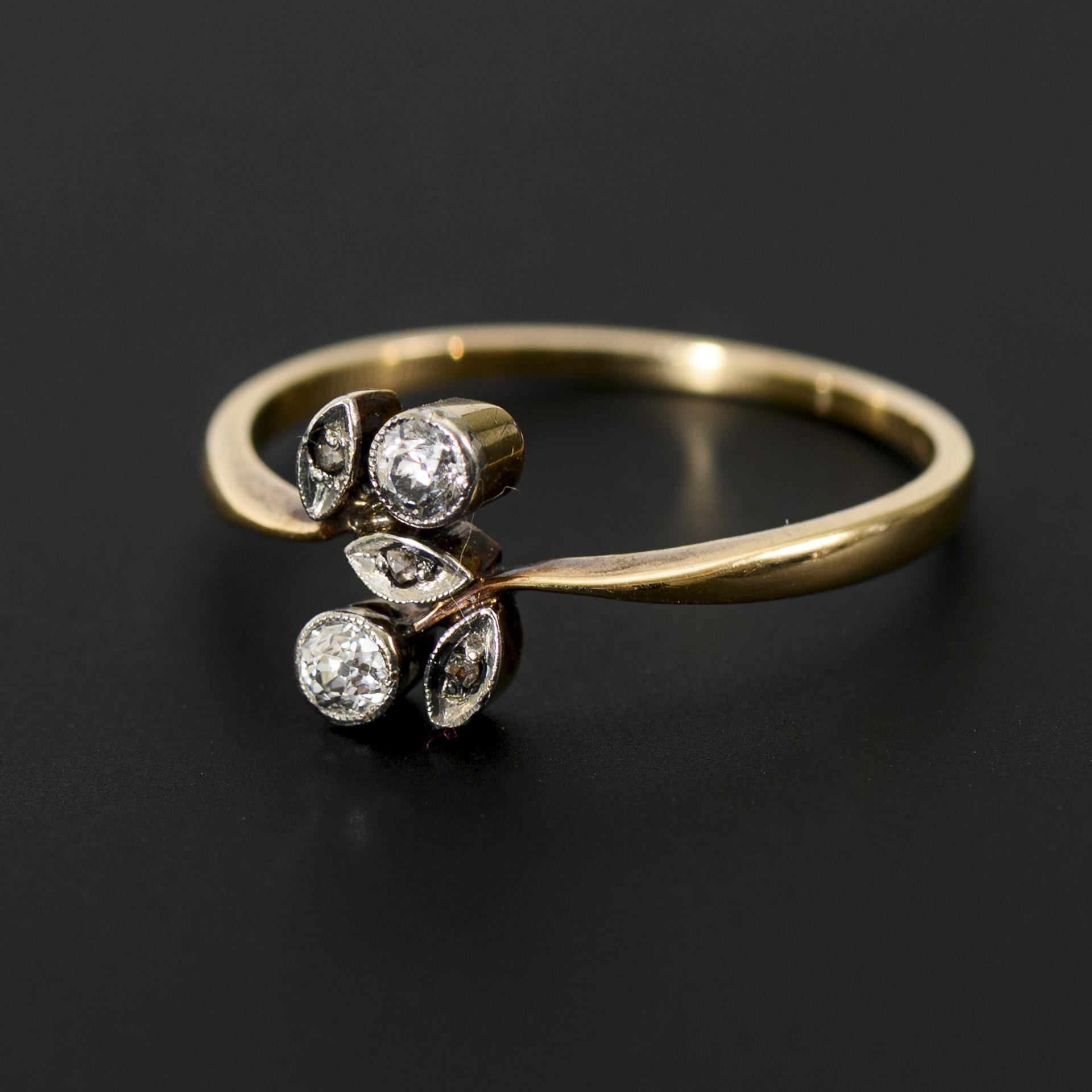 Zierlicher Ring mit 2 Altschliff-Brillanten in millegriffeverzierter Zargenfassung, in blütenartigem Entwurf mit 3 weiteren kleinen Diamanten. Unauffällige Tragespuren an den Steinfassungen.