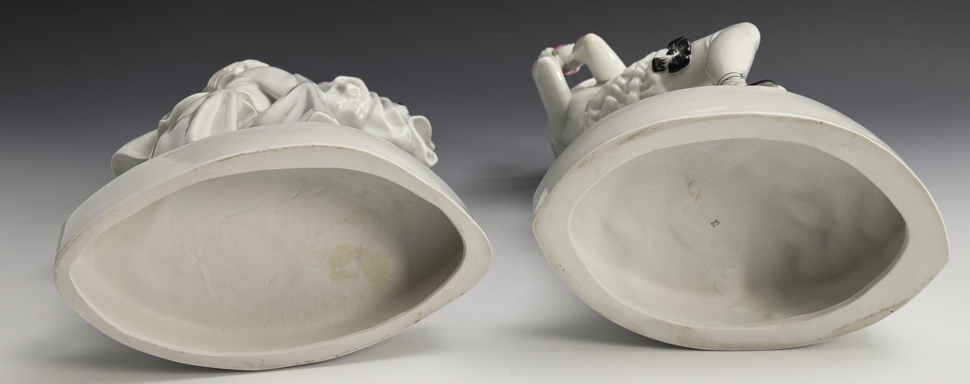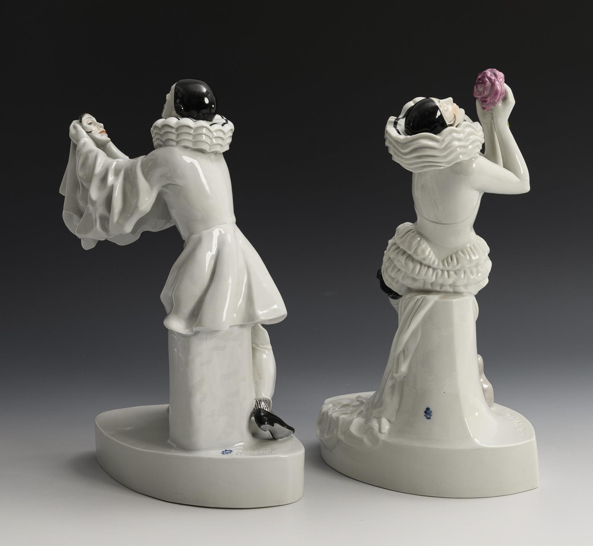 1x Bajazzo (Pierrot), Entwurf 1919: Auf einem Säulenstumpf sitzender Pierrot, wehmütig eine weibliche Maske betrachtend. / 1x Columbine, Entwurf 1923: Auf einem Sockel sitzende, eine große Rose in ihren Händen betrachtende Columbine.