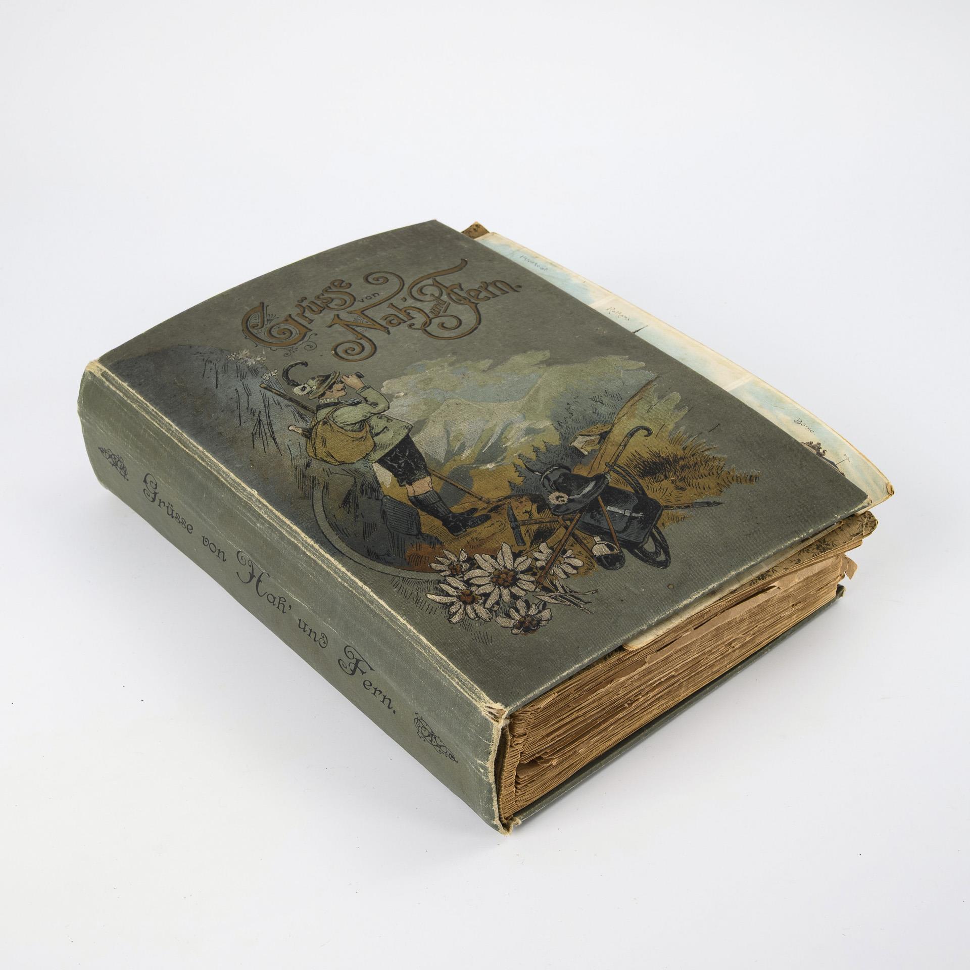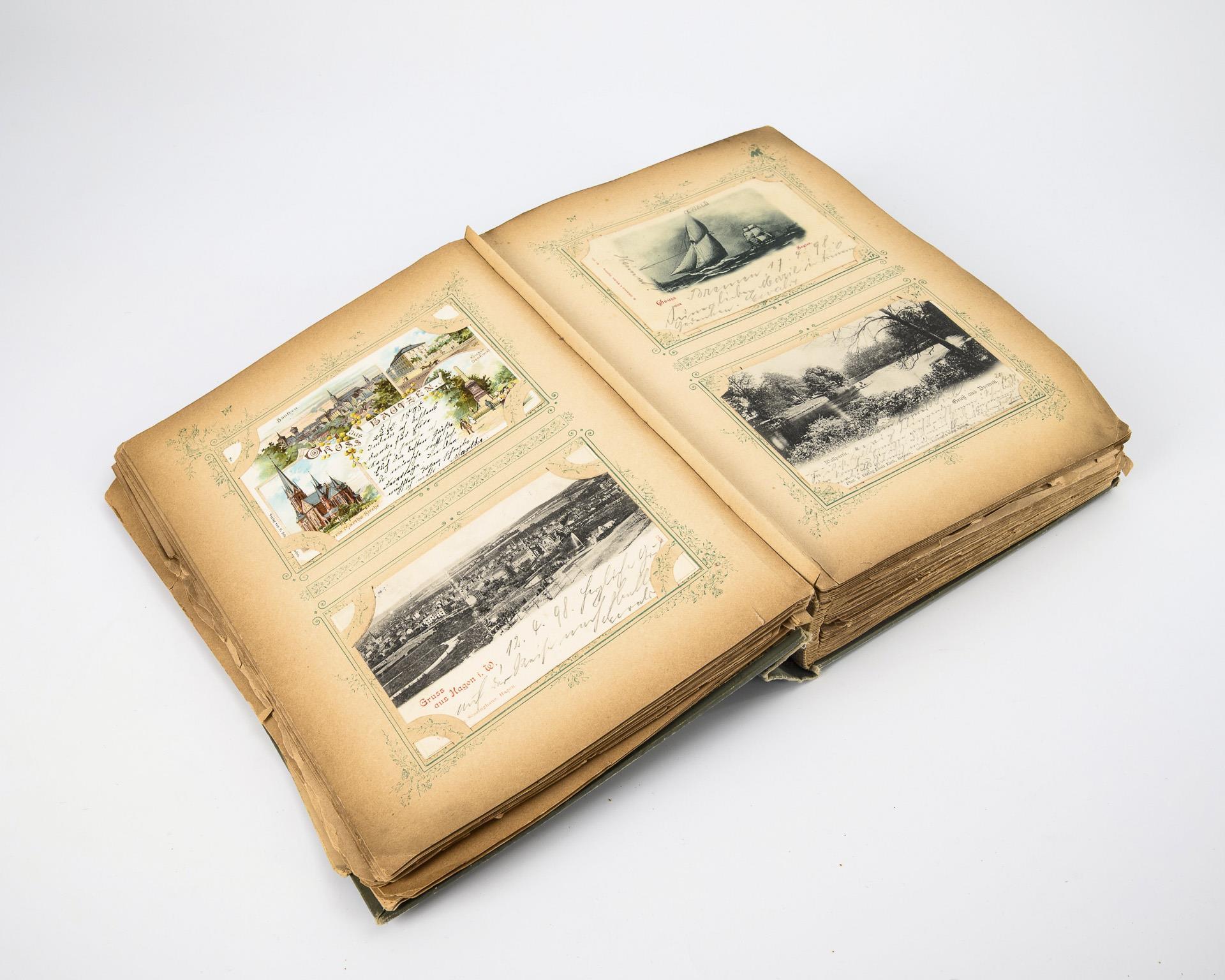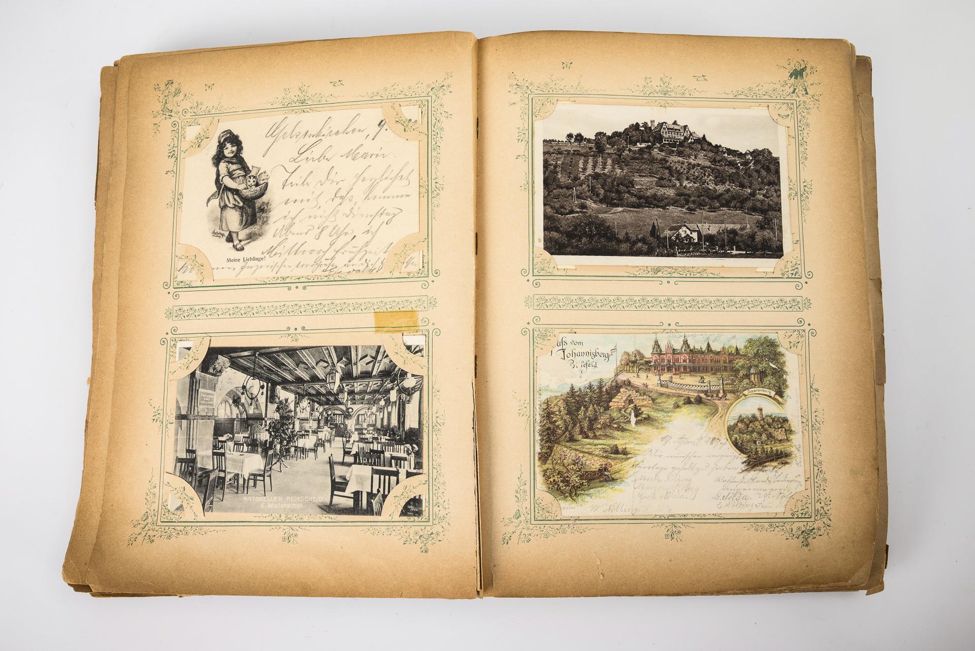 Dunkelgrünes Album mit einem Bergsteiger auf dem Gipfel. Zumeist an die Familie Windhausen in Dortmund gerichtete, zahlreiche "Gruß aus" Karten, z.B. Externsteine, Bautzen, Bielefeld, Elberfeld, Görlitz, Marienheide, Parderborn, Hohenlimburg, Kiel, Iserlohn, Halle, Coblenz, Warburg, Hannover, Dresden, Ems, Berlin, Hamburg usw.. Des weiteren 6 Schiffsdarstellungen: SrM Torpedoboot-Division, Linienschiff Weissenburg, Yacht Hohenzollern, SMS Hela, SM Yacht Meteor und SMS Condor. 1 Karte aus der Serien zur Weltausstellung 1900 in Paris. 2 Karten von afrikanischen Kirchen. 2 Silhouettenkarten, davon 1 Wohlfahrtskarte für Veteranen. 1 Karte mit Metalleffekt (Kassel Wilhelmshöhe). Einige Postkarten (häufig Oster- bzw. Weihnachtsgrüße) lose beiliegend. Album defekt, Karten teils Alters-/Gebrauchsspuren (Riesenpostkarte mit Riss, Knickspuren und geringer Fehlstelle).