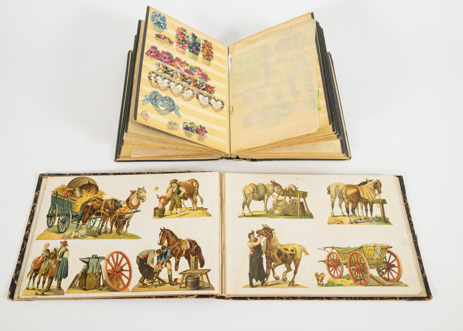 Luxuspapiere bzw. Glanzbilder verschiedenster Themen. Marmorierter Halbledereinband innen mit handschriftlicher Widmung von 1901. Auf den Pappseiten zumeist Tiere, Kinder, auch Eisenbahn und Militär ("Ostasiatische Jäger-Kompanie" mit "Generalfeldmarschall Graf Waldersee" bzw. "2. Königl. Sächs. Ulanen-Regiment No 18 Leipzig!). / "Scraps" betiteltes Album u.a. mit 2 Kampfszenen zwischen Indianern und Weißen. / Leinenalbum mit leinenbezogenen Seiten zumeist Farblithografien, teils englisch beschriftet. / Dickes Briefmarkenalbum mit lose eingesteckten Bildern. Alben zumeist defekt, teils auch Schäden an den Bildern.