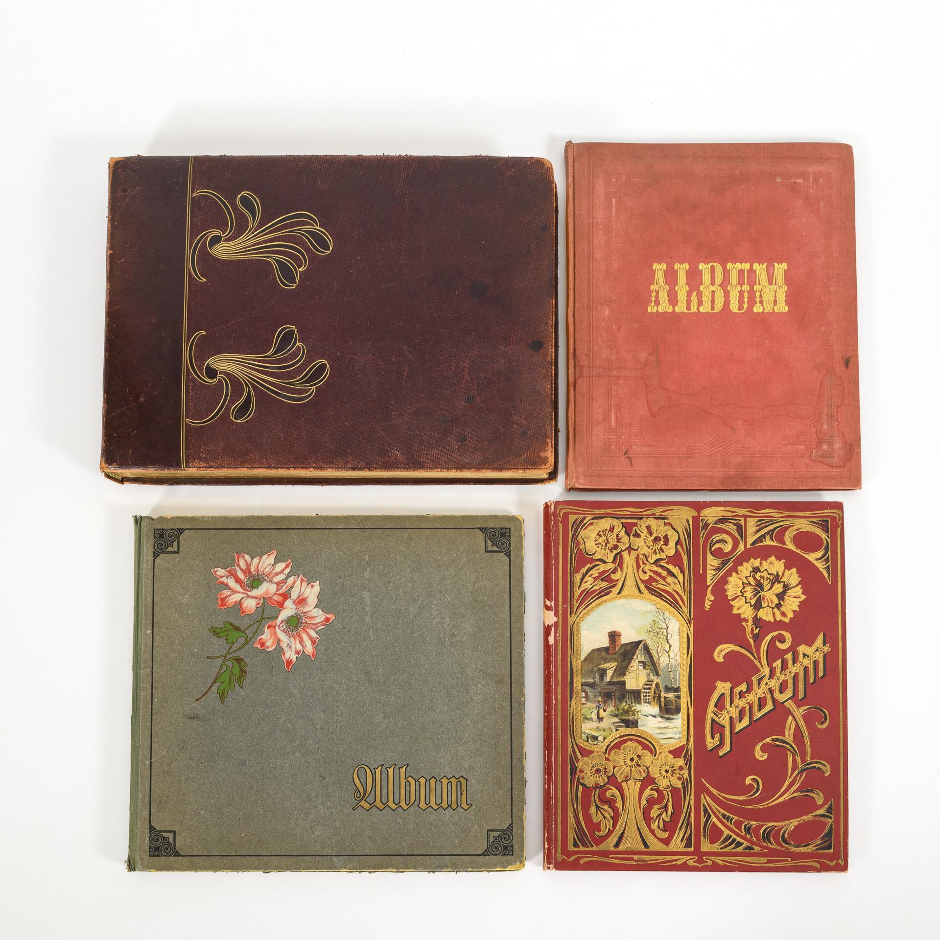 Dunkelrotes Lederalbum mit Goldprägung innen Weihnachten 1903 datiert: Vielfach Werbung, teils aus Serien (z.B. Knorr, Lück in Colberg, Lahusen, Palmin usw., auch einige Zigarettenbilder als Fotodrucke mit Schönheiten. / Goldgeprägtes rotes Album mit Mühlenbild: Innen Widmung mit Datum 1906. Hier einige Seiten ausgeschnitten und etliche Oblaten entfernt. / Graues Album mit Blumendekor: Teils für fehlende Seiten nachträglich eingefügte, einige entfernte Oblaten. / Album mit geprägtem roten Leineneinband: Hier als Besonderheit 5 Indianerdarstellungen, 1 Fehlseite. Einige Alters-/Gebrauchsspuren.