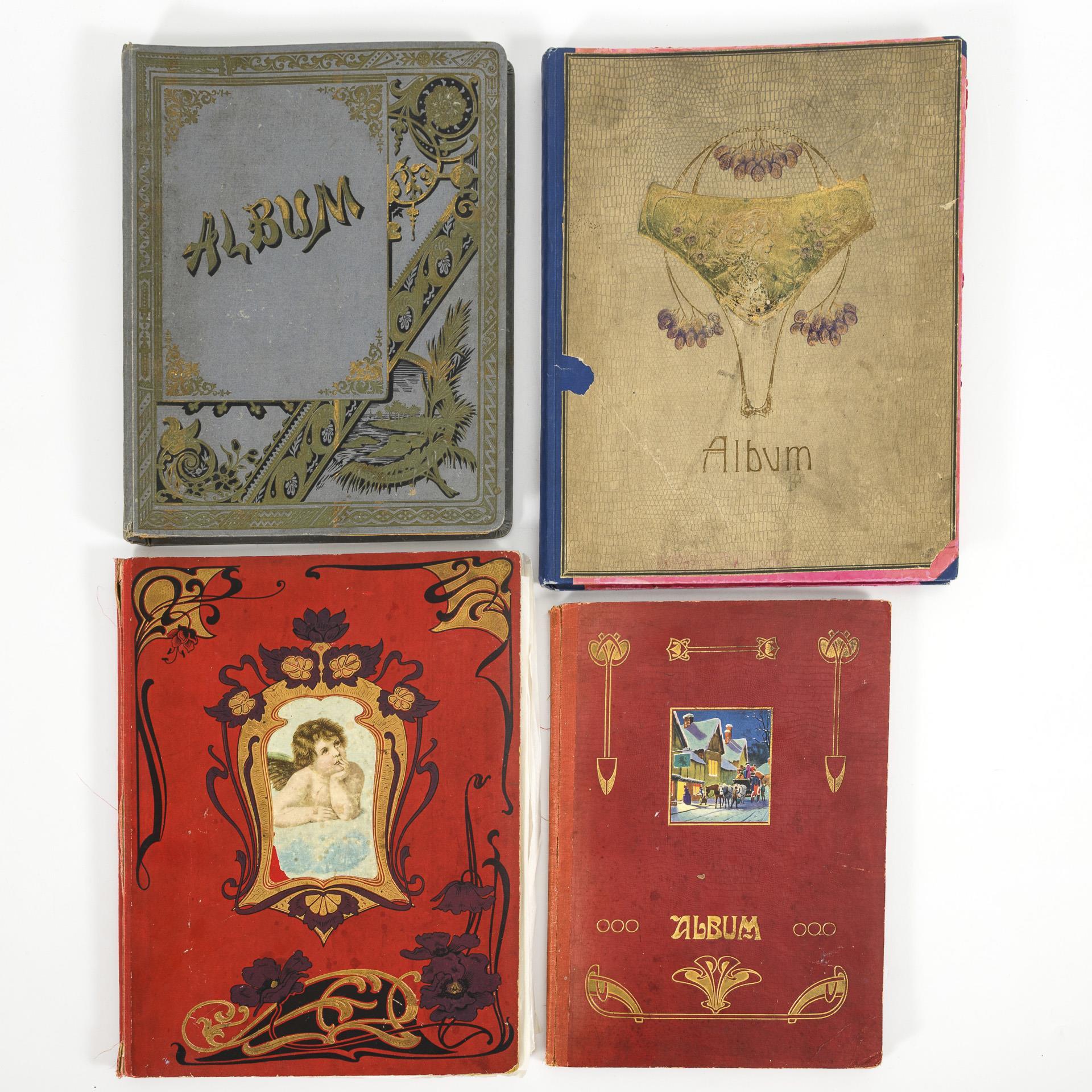 Verschiedene Jugendstil-Alben je fast vollständig mit Luxuspapieren bzw. Glanzbildern verschiedenster Themen beklebt: Blumen, Kinder, Genre, Tiere, Weihnachten, Ostern, Religion, teils auch Exotika und Militär. Starke Alters-/Gebrauchsspuren an den Alben, wenige Bilder mit Defekten.