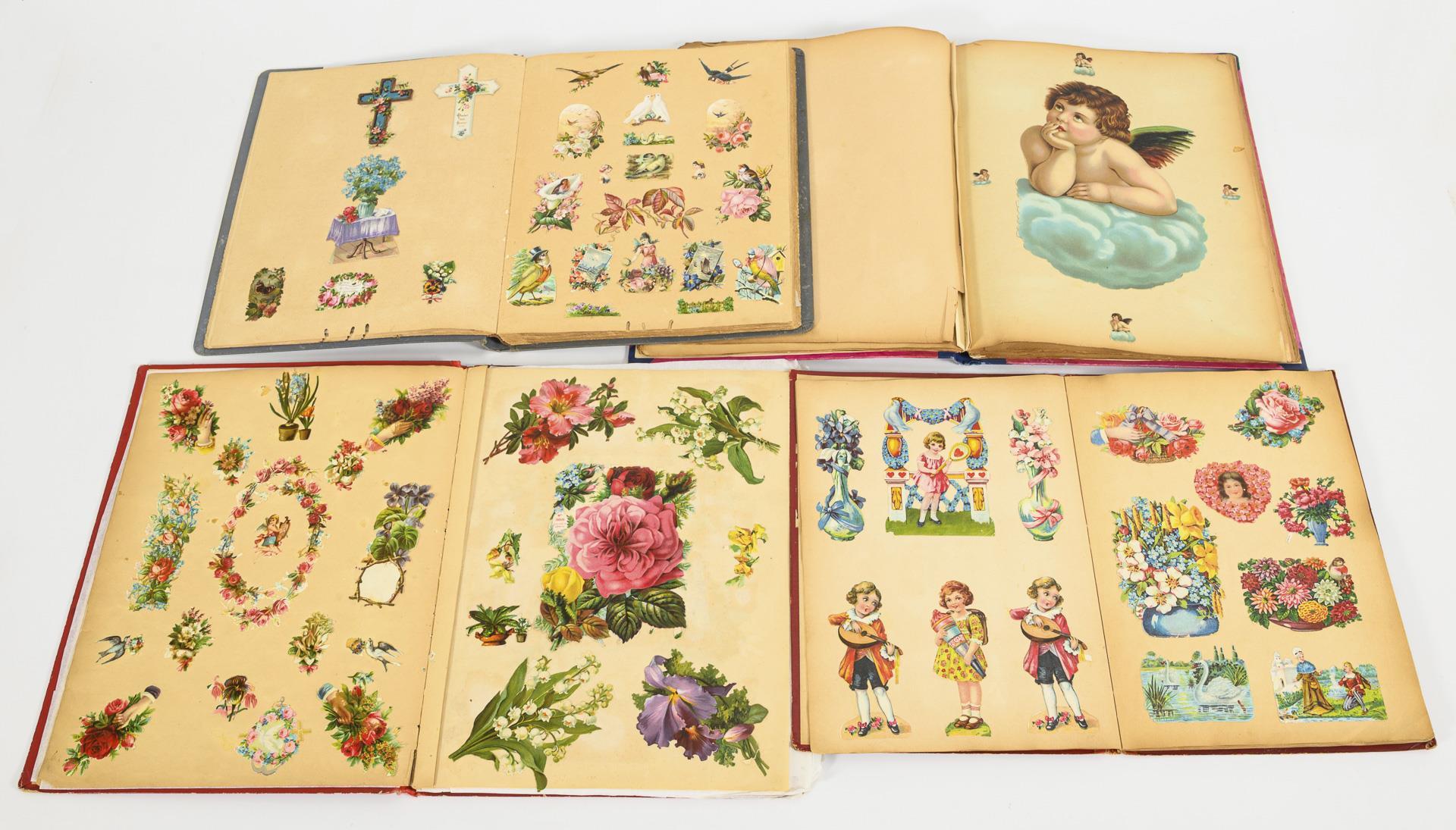 Eingeklebte Farblithografien zumeist geprägt und gestanzt, verzierte Alben. Alben maximal 35 x 28 cm. Gesamt 3,1 kg.