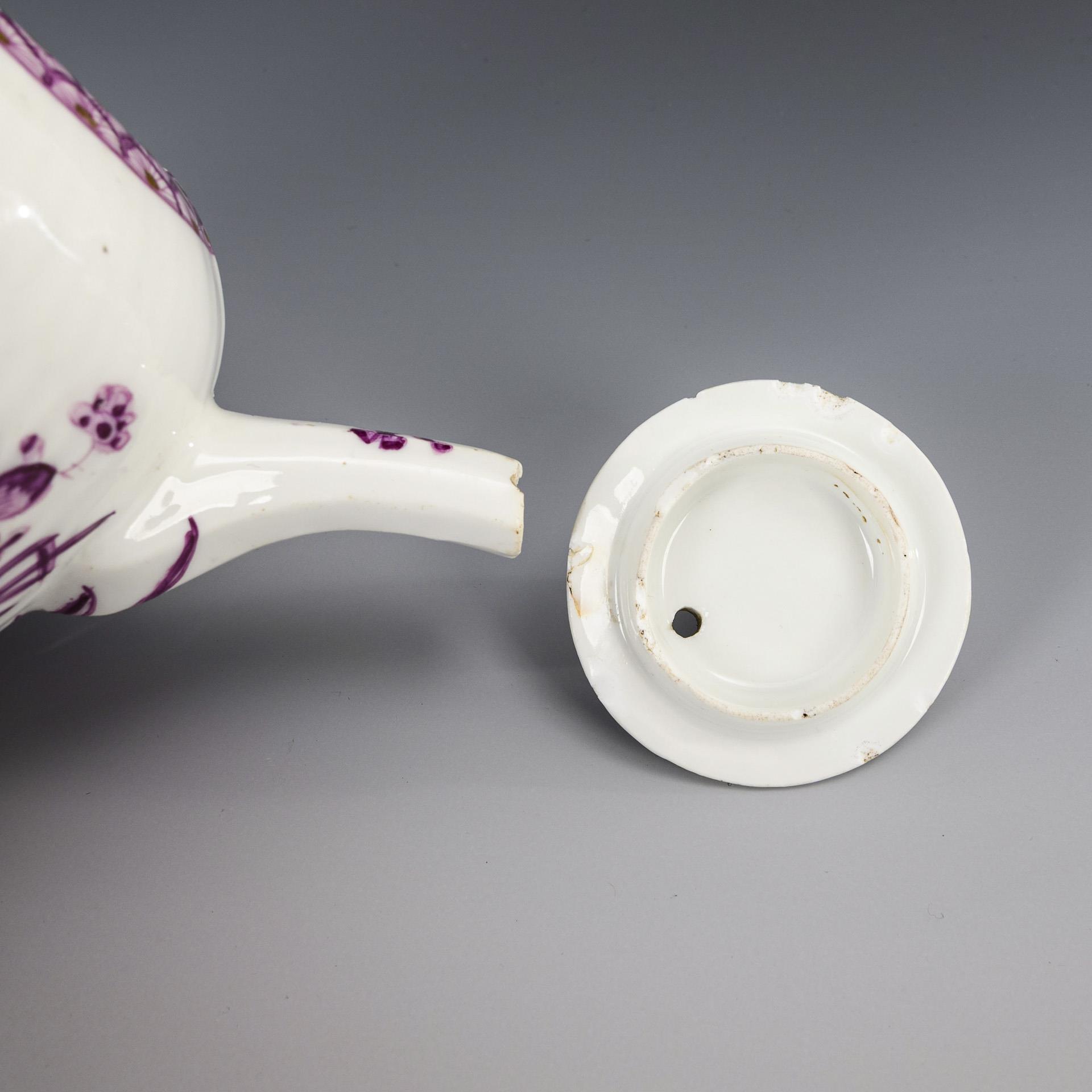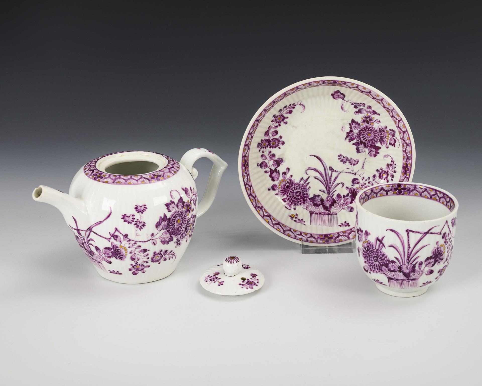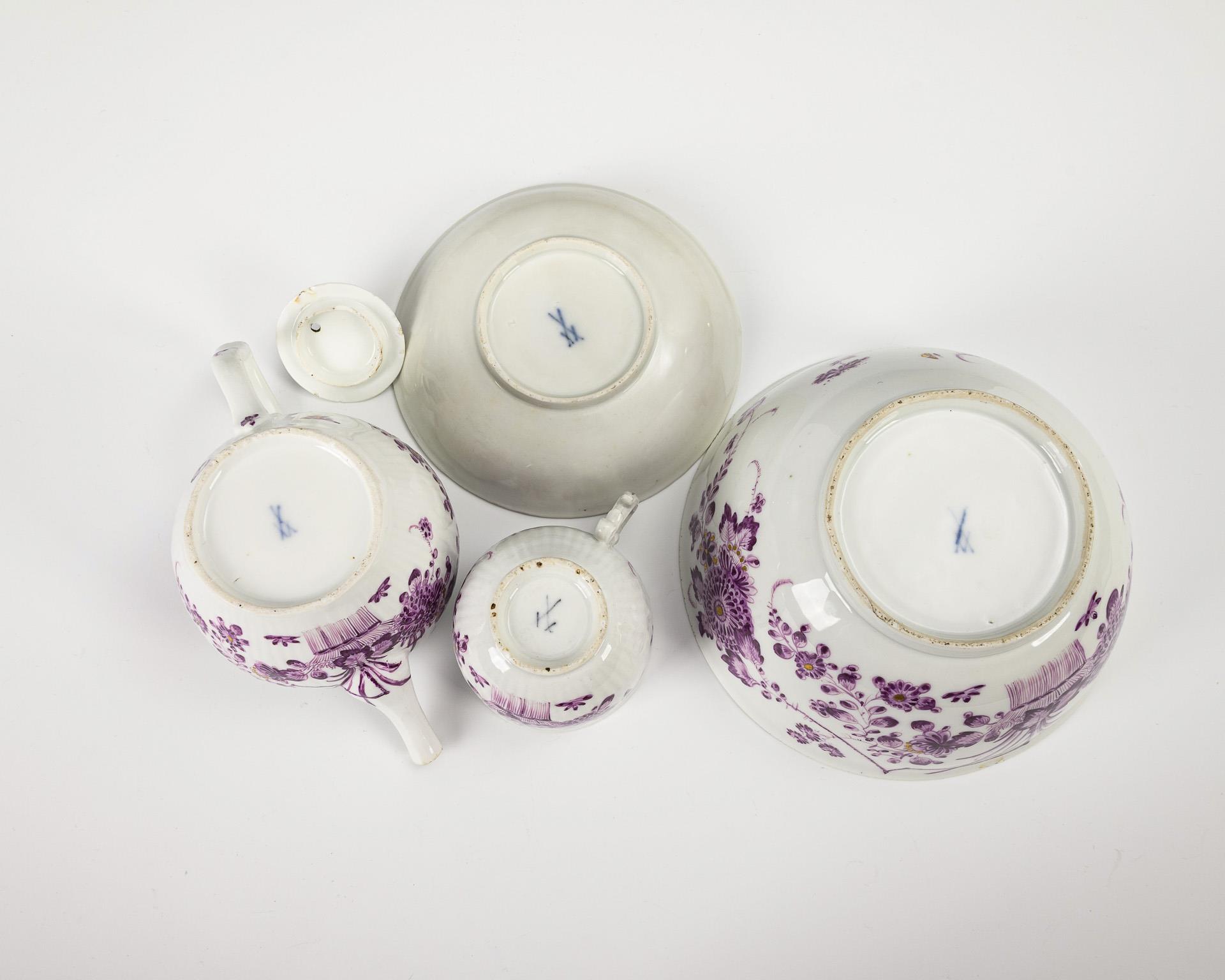 Form "Gebrochener Stab". Kumme (H 8,5 cm), Teekännchen (H 10 cm), Tasse (H 7 cm) und Untertasse (Ø 13,5 cm). Deckelrand und -innenrand bestoßen, Schneppe des Teekännchens bestoßen, Haarriss im Tassenhenkel, Bestoßung am Standring der Untertasse.
