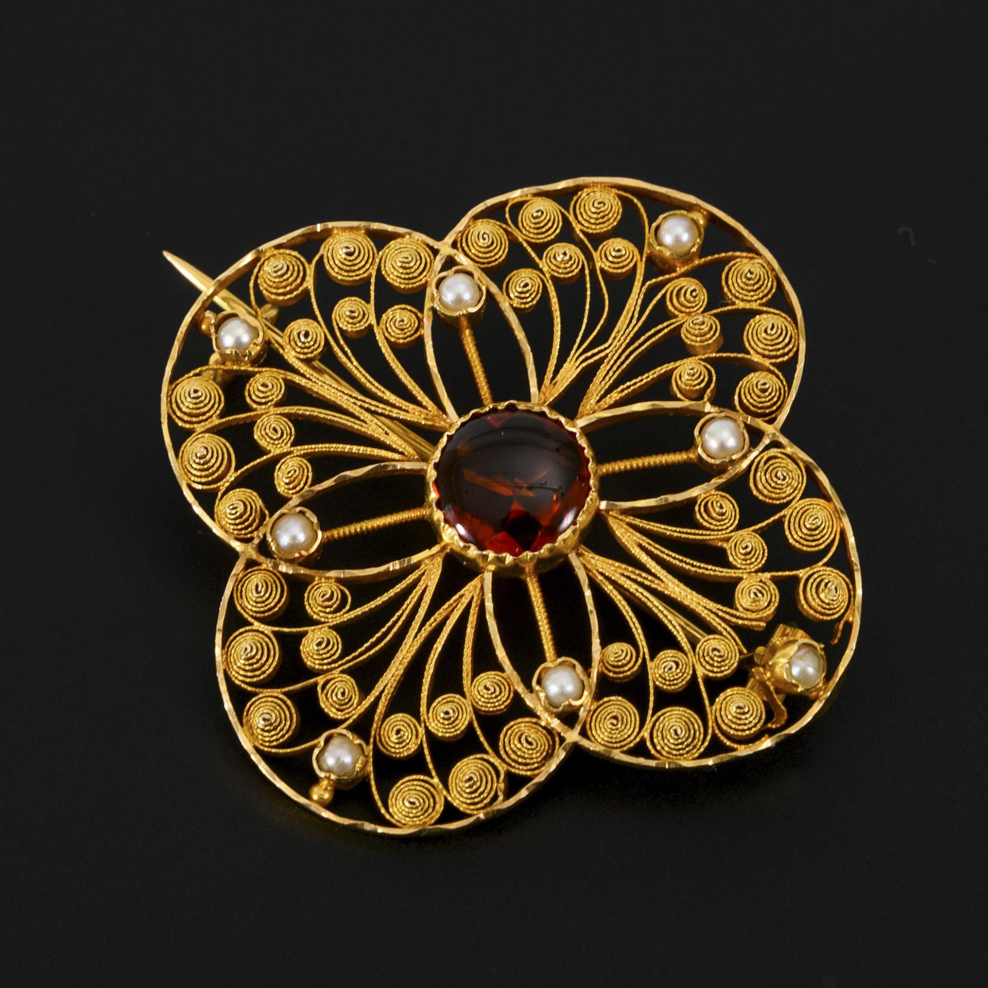 Jugendstil-Goldfiligranbrosche aus dem Jahr 1904 eines Göteborger Juweliers mit einem Citrin und 8 halbierten Saatperlen. Eine Perle gebrochen, hält sicher in der Fassung, Nadel leicht verbogen.