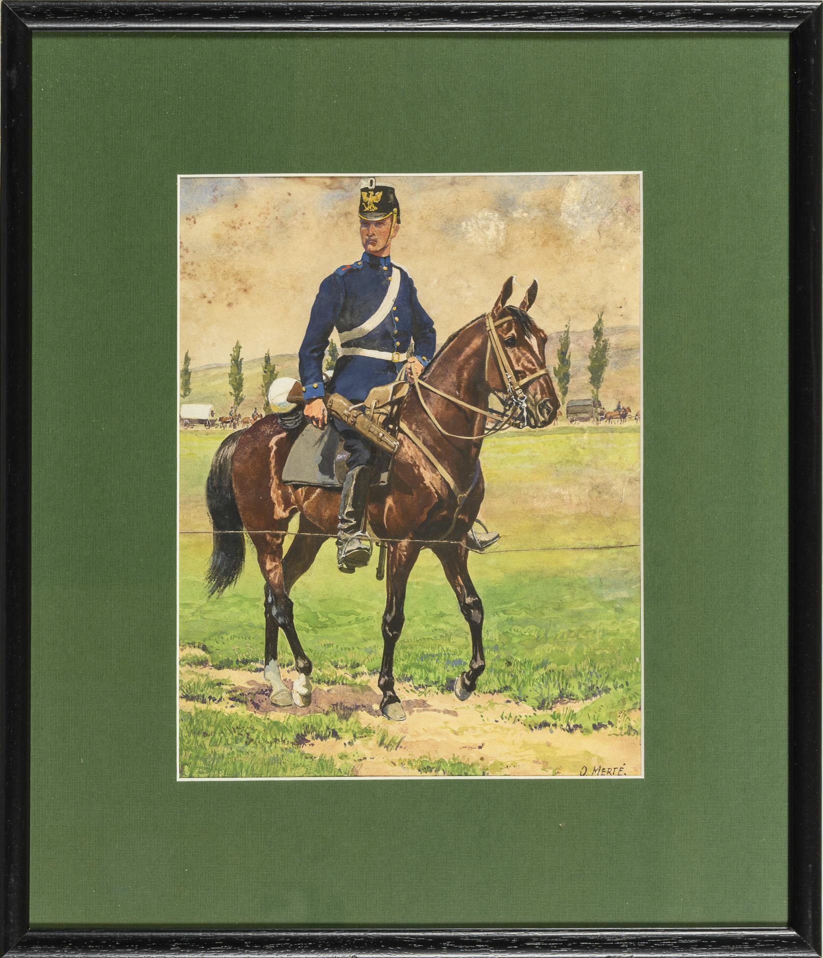 In kräftigen Farben treffend erfasste Soldaten: Offizier des 7. Regimentes zu Pferde mit Tross im Hintergrund. Galoppierender Reiter mit Kanonier-Tross im Hintergrund. Stehender Kanonier vor einer Lafette. Stehender Kanonier des 9. Regimentes vor einer Geschützstellung in Aktion. Stehender Soldat am Ufer mit Pionieren beim Brückenbau. Blätter je mittig zerschnitten, 1 kleiner Riss am Rand, je Alters-/Gebrauchsspuren.