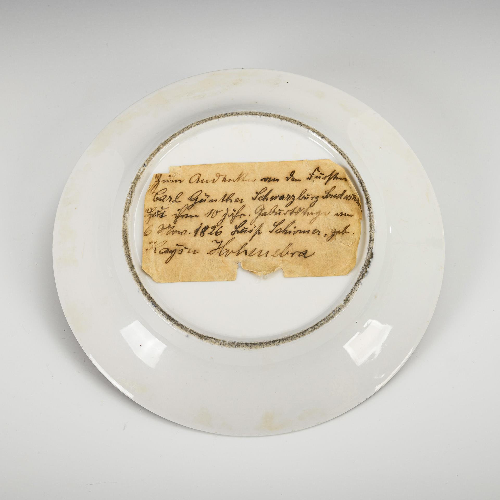 Glatter Teller mit floraler Goldbemalung auf der Fahne, im Spiegel die Ansicht einer Kirche und eines Straßenzuges mit Glocke. Verso ein Klebezettel mit der Aufschrift "Zum Andenken an den Fürsten Carl Günther Schwarzburg-Sondershausen für ihren 10jähr. Geburtstage am 6. Sber. (?) 1826 Luise Schirmer, geb. Kayser Hohenebra". Gold berieben.