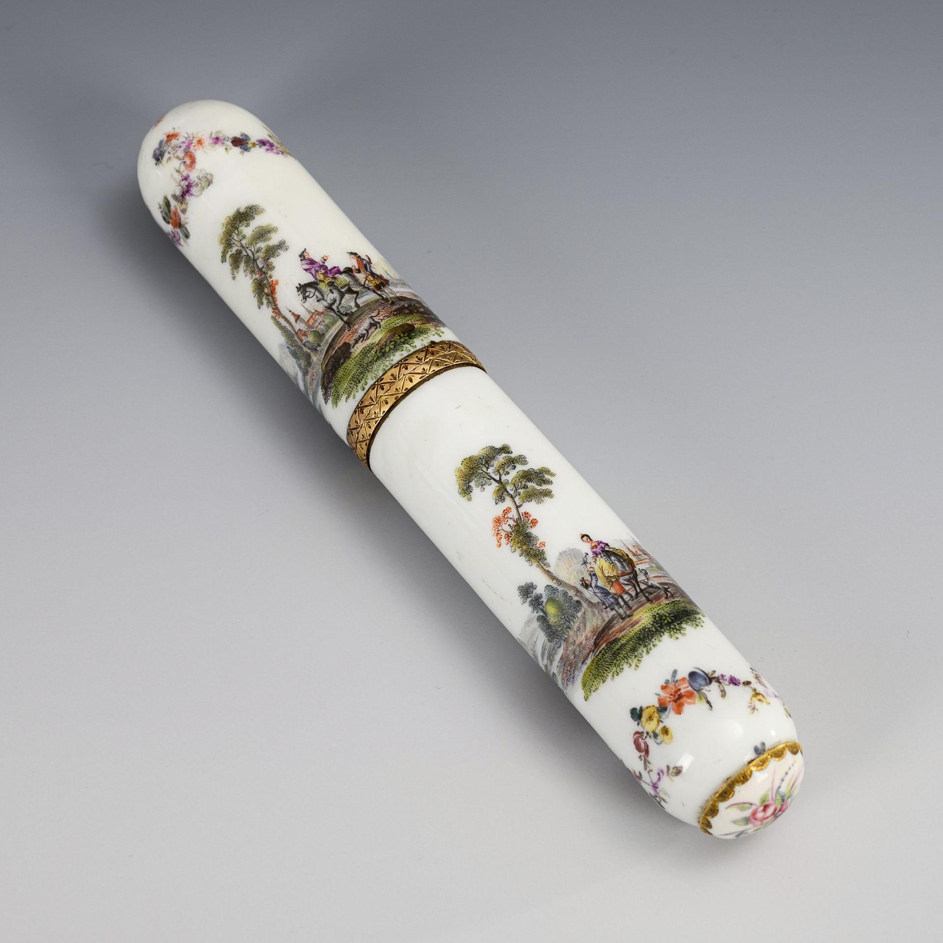 Zylindrischer Behälter mit Metallmontierung. Fein bemalt mit galanten Figuren und Reiterszenen in weiten Landschaften. Restaurierter Riss am Deckel.
