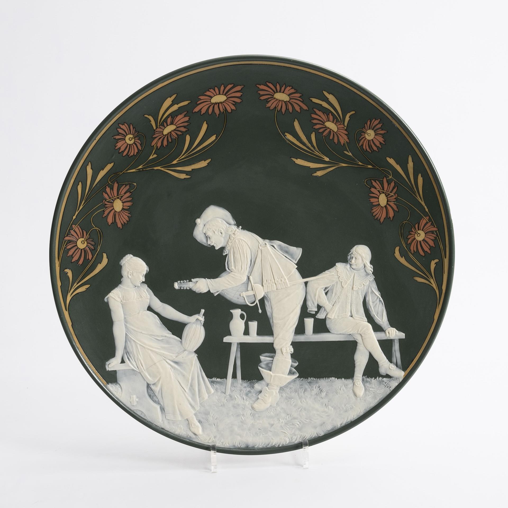 Steinzeug, mattgrüner Fond, durchscheinend weiße Figurenreliefs in Art der Pâte-sur-pâte-Malerei und der Wedgwood-Ware, floraler Chromolithdekor. Ø 45 cm.