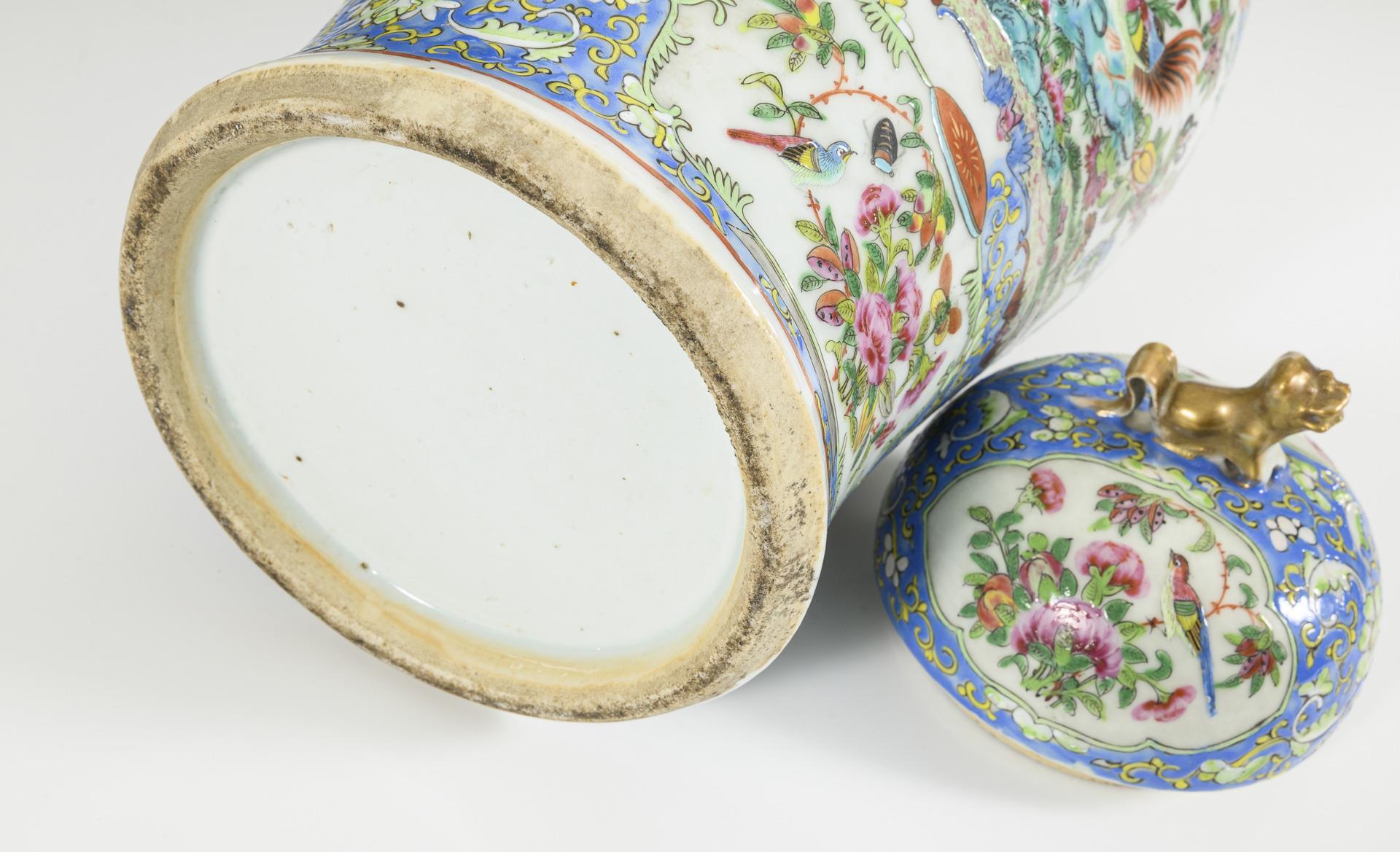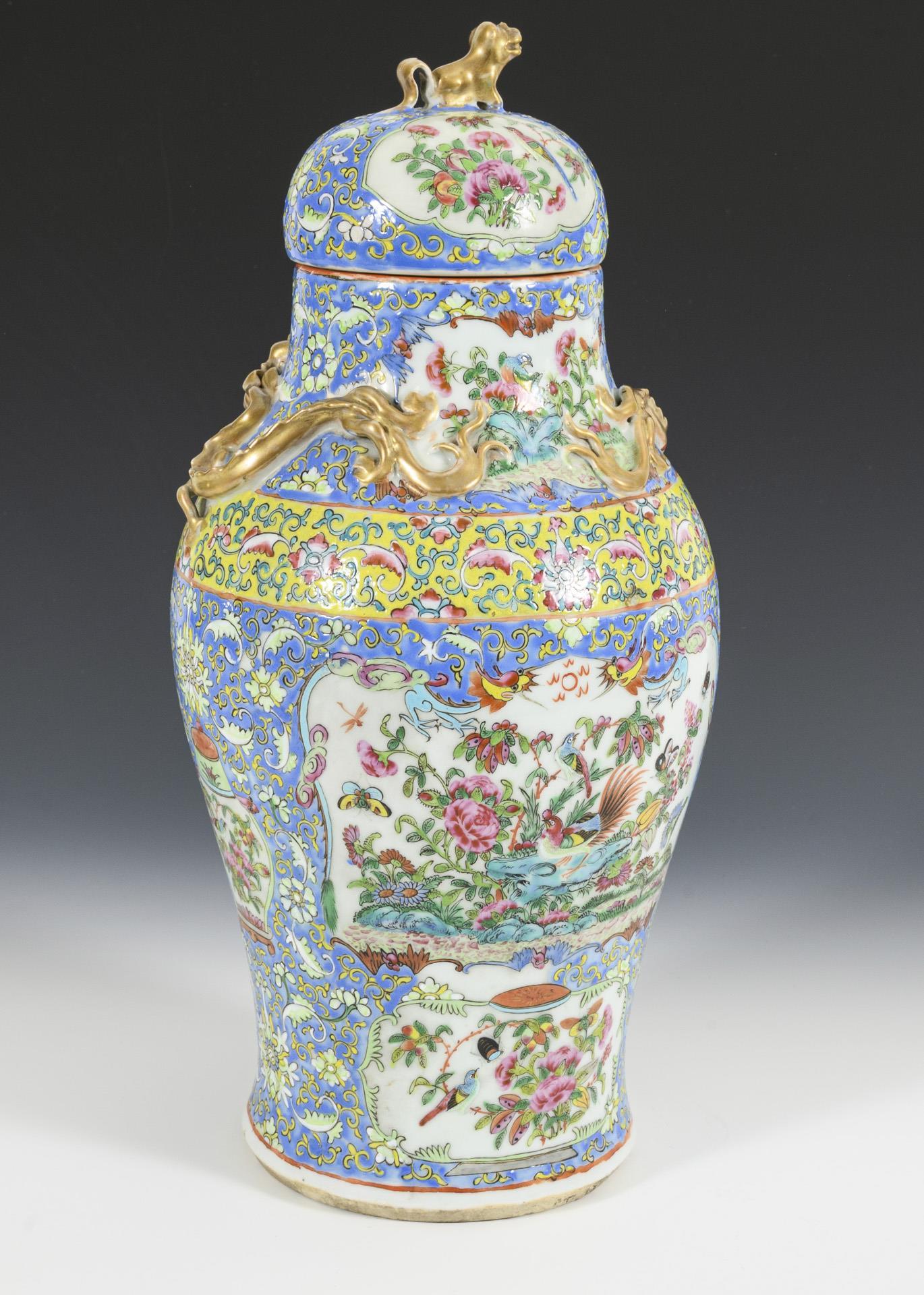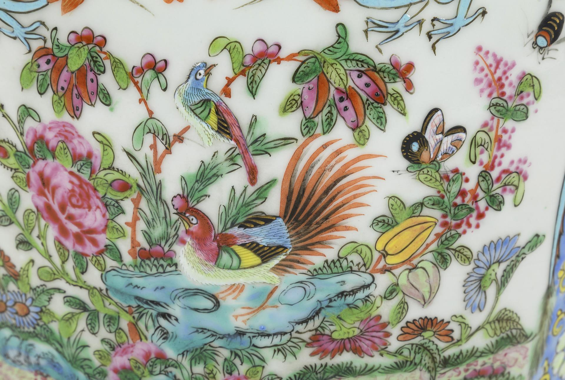 Polychrome Malerei mit farbkräftigen Emailfarben. Bildkartuschen mit Blumen- und Vogelmotiven, umgeben von reichem Rankenmuster. Drachenförmige, flache Handhaben.