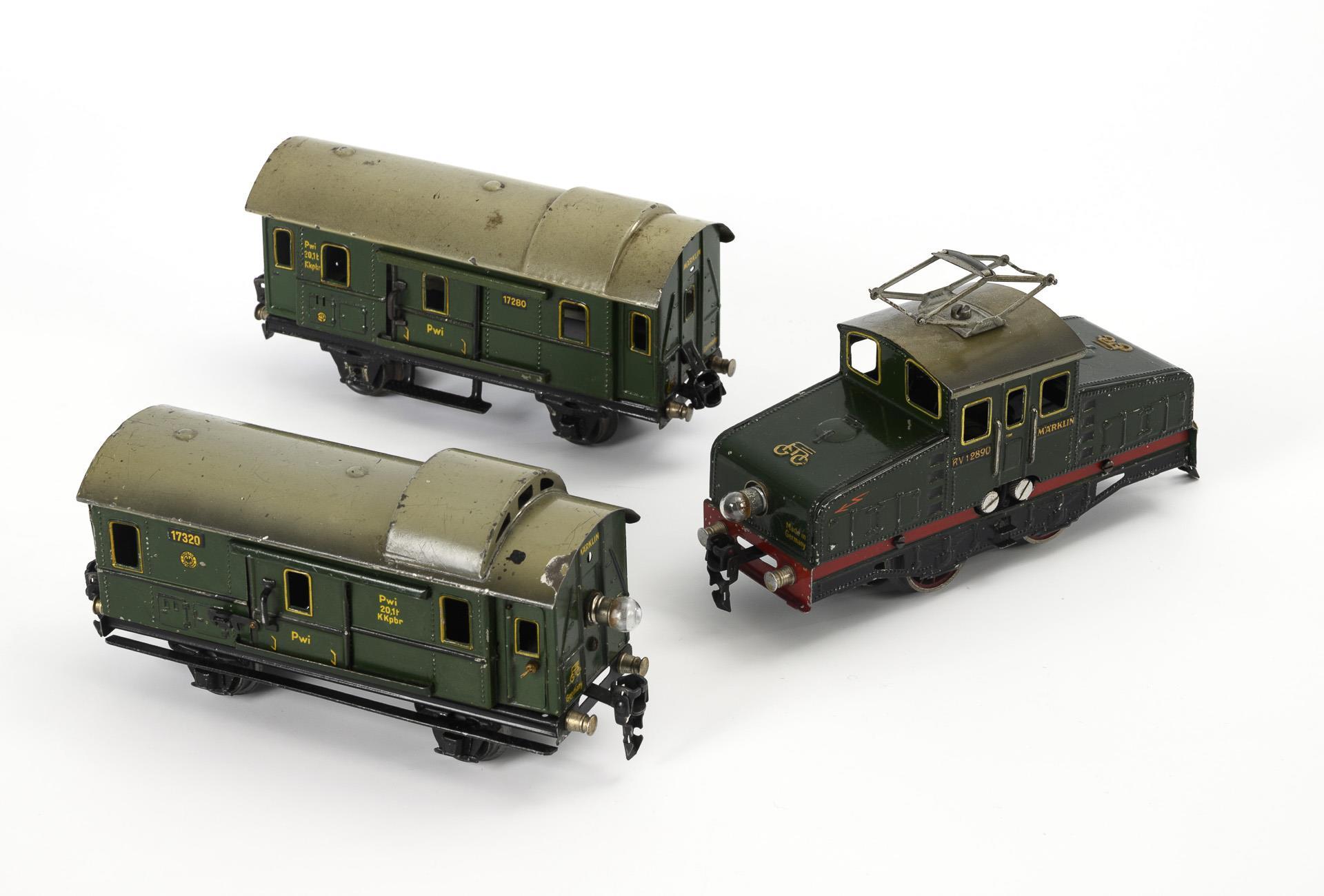 Spur 0. Triebwagen RV12890 für Elektrobetrieb, Funktion nicht geprüft. Dazu 2 Gepäck-Wagen (17320 und 17280) und 2 Personenwagen (17190). Teils Defekte und Kratzer.