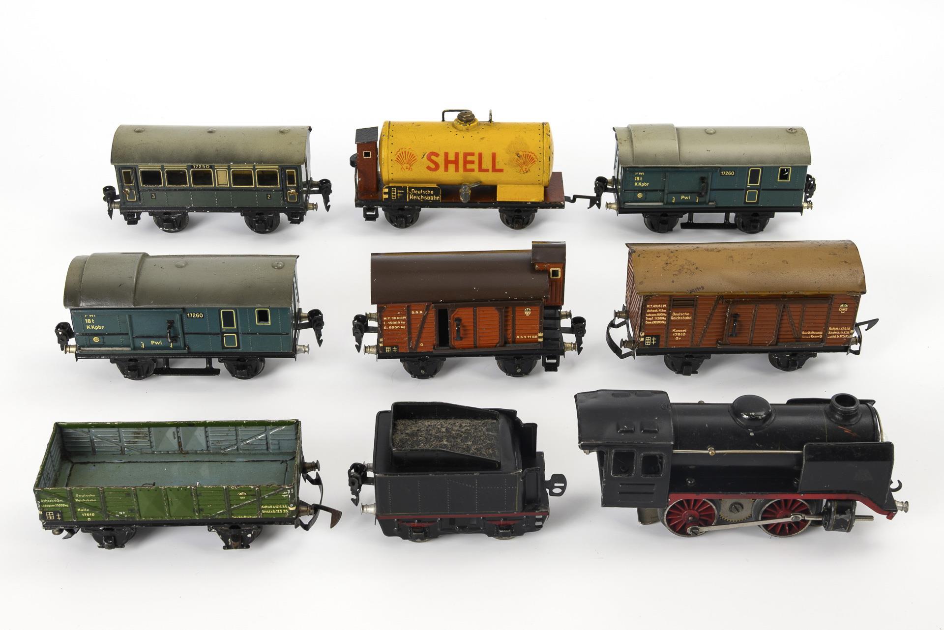 Spur 0. Schwarze Lok für Elektrobetrieb, dazu Tender, 4 Gepäckwagen, 1 Flachwagen und 1 Kesselwagen "Shell 17740". Funktion nicht geprüft. Stark bespielt, mit Altersspuren und Defekten.