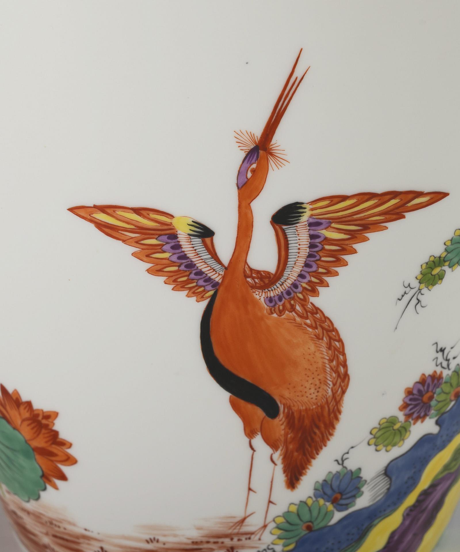 Balustervase mit Kugelnknaufdeckel. Umlaufend indianische Blumenmalerei mit Schmetterlingen und Kranichen.