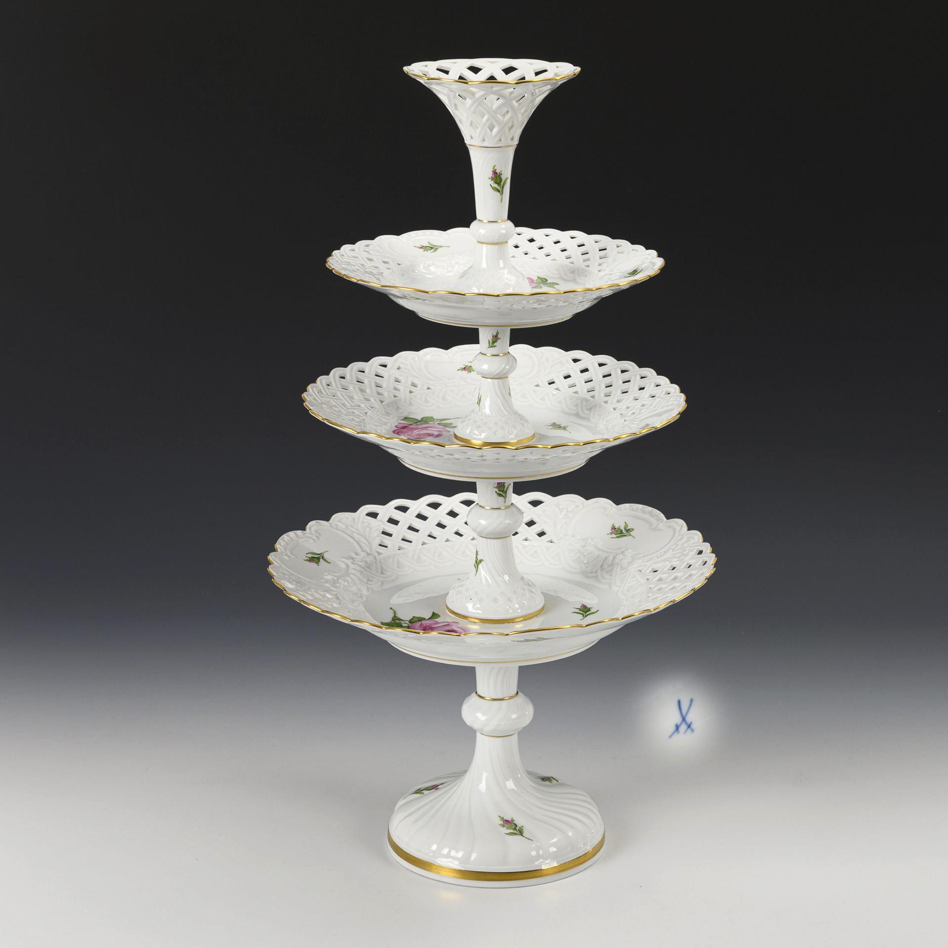 Etagere mit drei Durchbruchtellern und einer kleinen Vase als Abschluss.