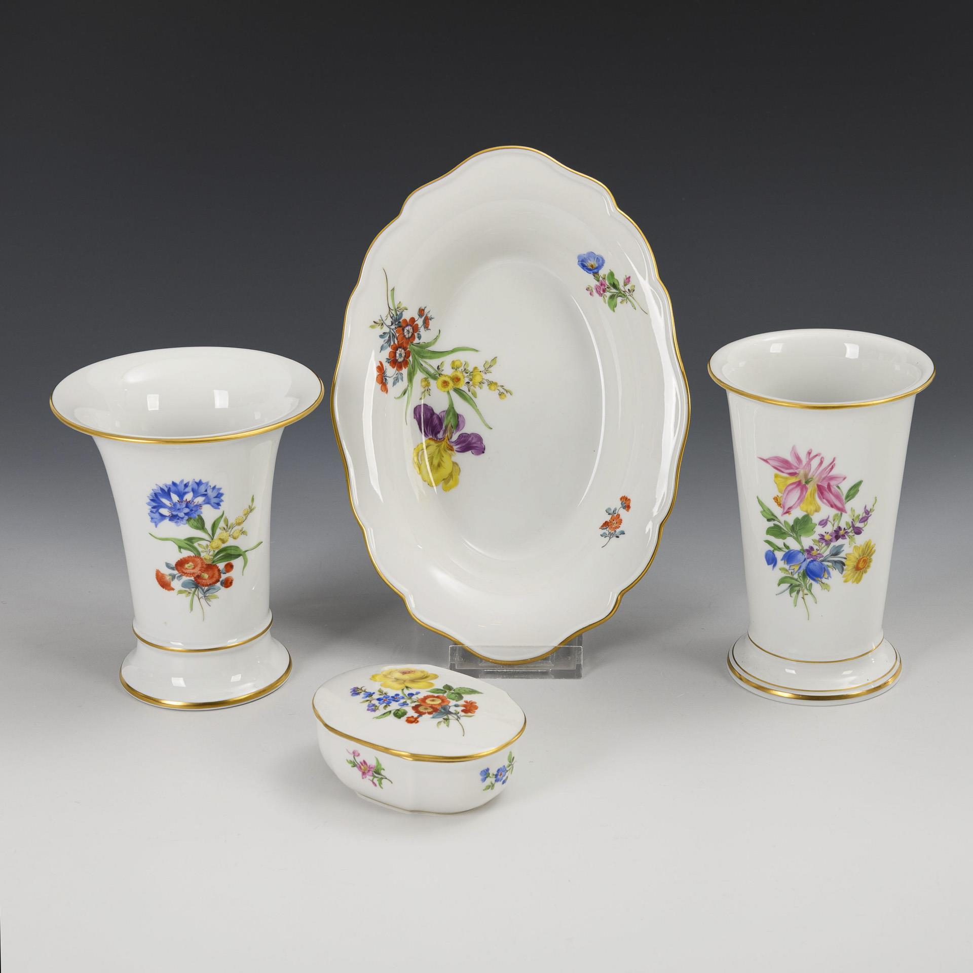 2 Vasen, 1 Schale und 1 Dose. Meissen.