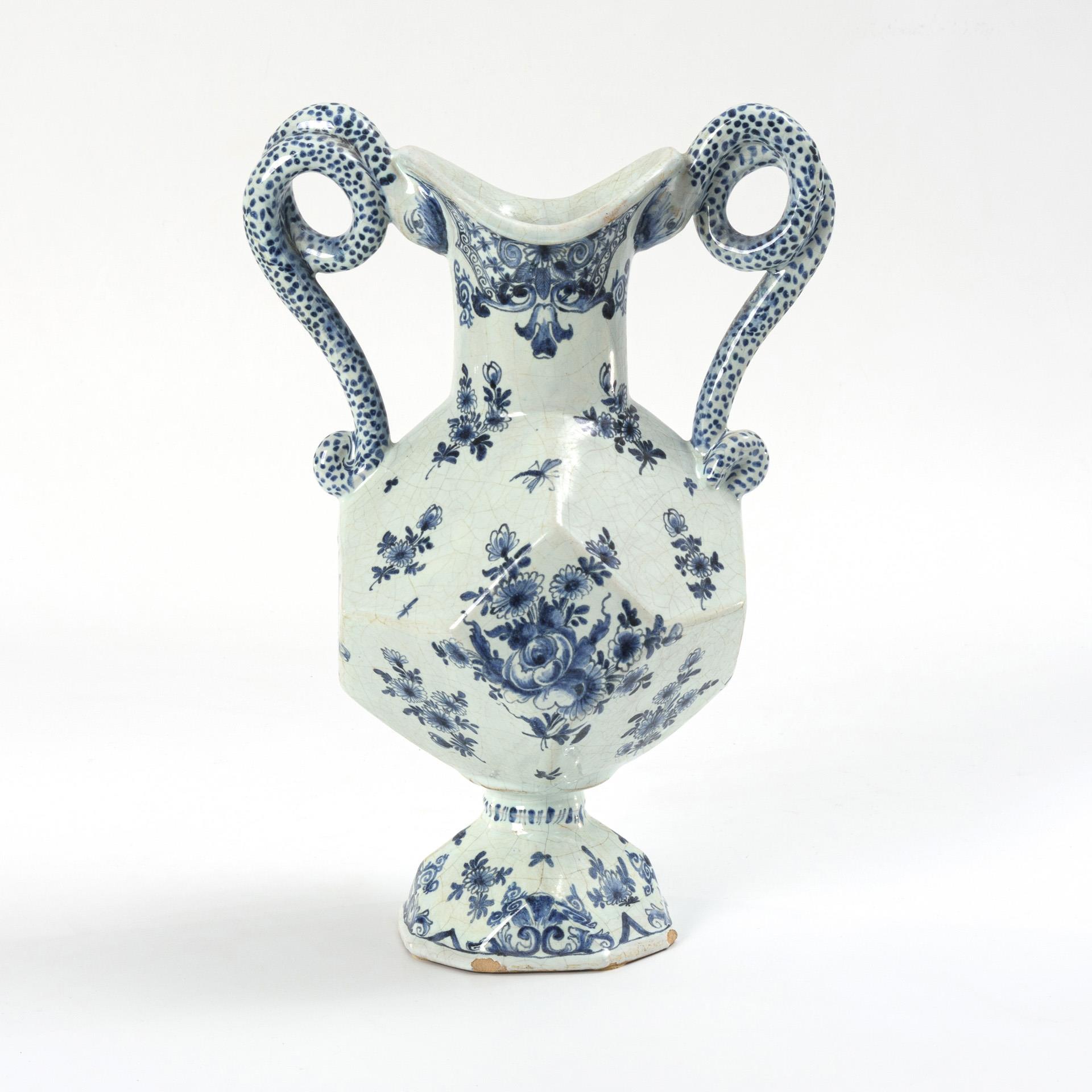 Sie befinden sich hier: Startseite Kategorien Keramik Außergewöhnliche Delfter Fayence-Schlangenhenkelvase mit facettiertem Korpus