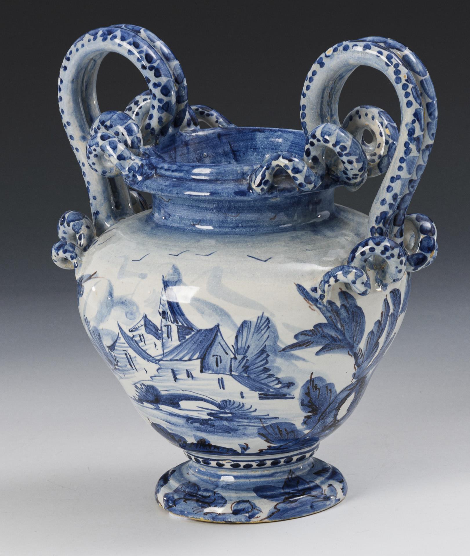 Balustervase mit stark hochgezogenen Doppelschlangenhenkeln, auf Rundfuß. Schauseitig eine thronende Antikenfigur mit Speer, verso Architektur in Landschaft. Partiell leicht bestoßen, 1 Henkelansatz leicht rissig.