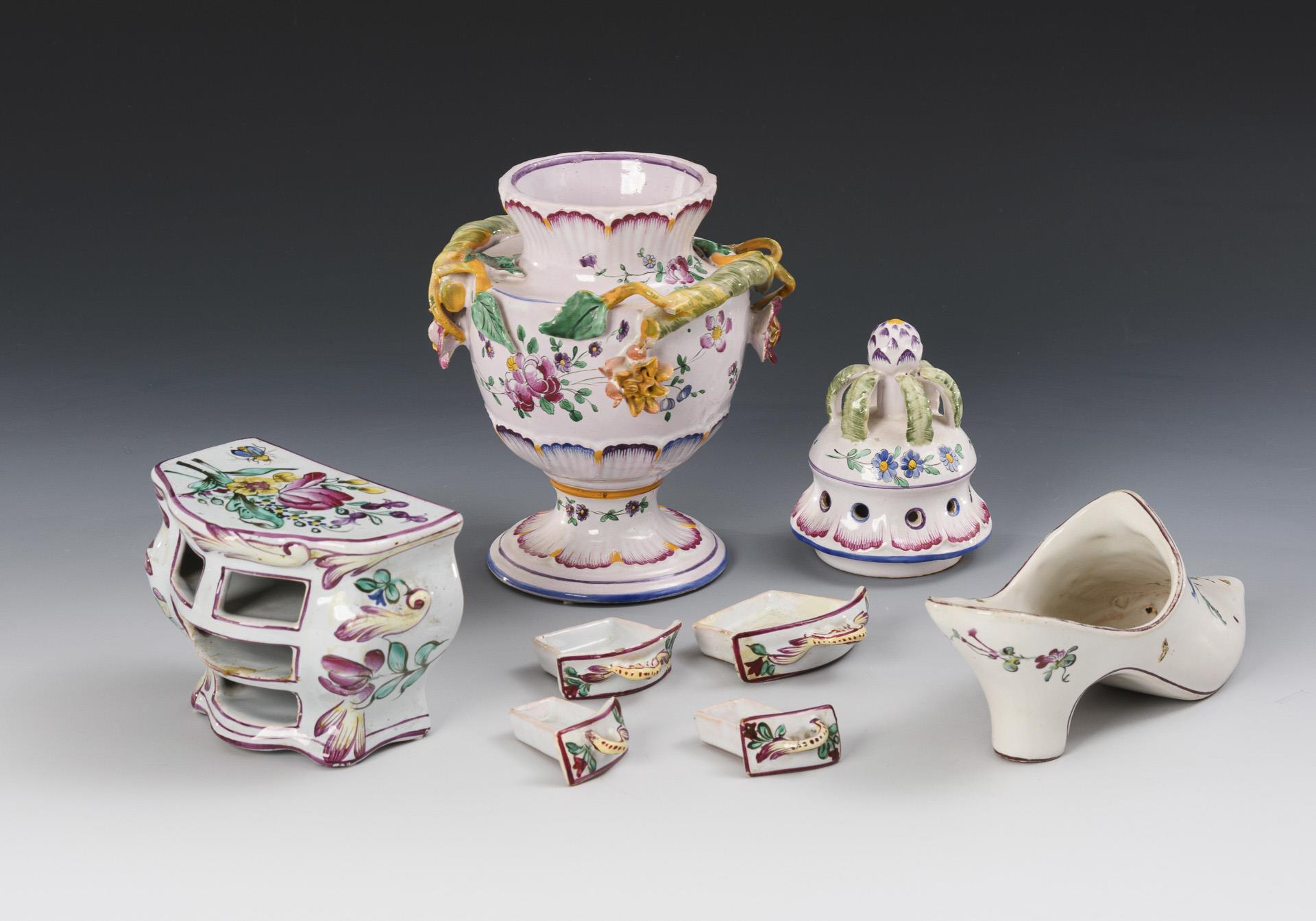 Urnenvase mit Blütenbelag und Rundfuß, Deckel mit Fruchtknauf und Löchern (H 24,5 cm). Spitzer Barockschuh mit Blumenmalerei und Insekten (L 20 cm). Vierschübige Barock-Kommode mit Blumenmalerei und Insekten (H 9 cm). Partiell bestoßen und berieben, restauriert, Vase mit Haarriss.
