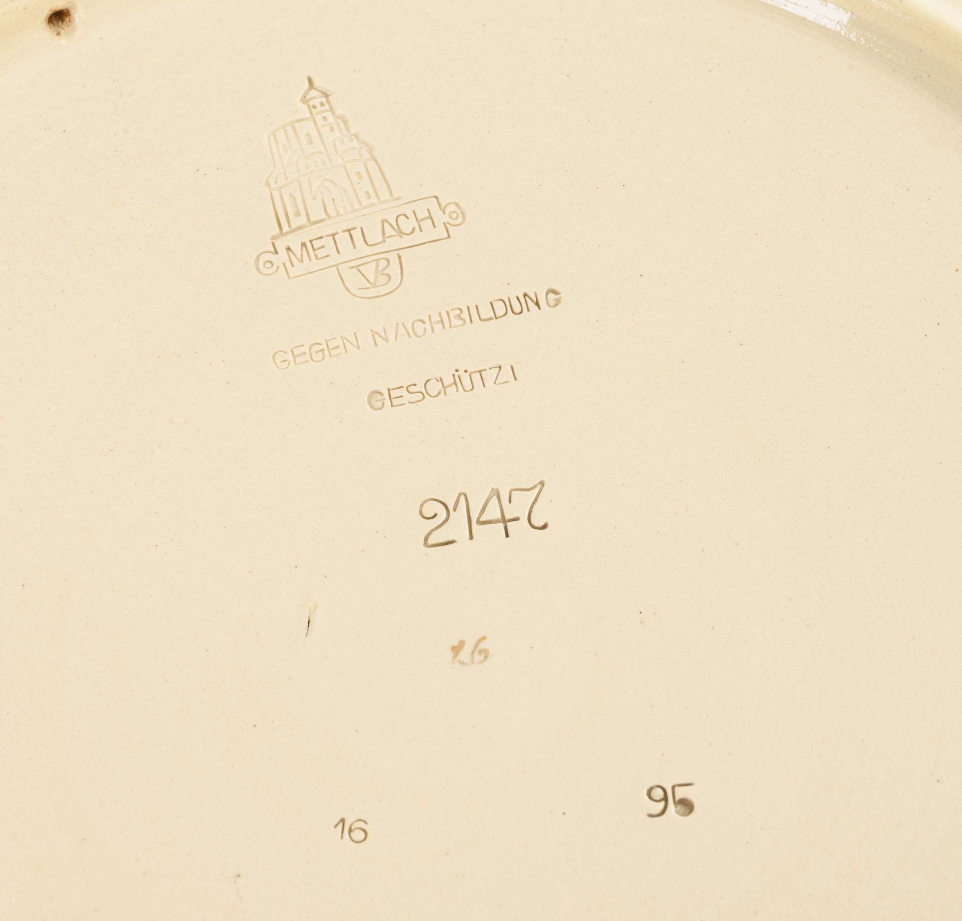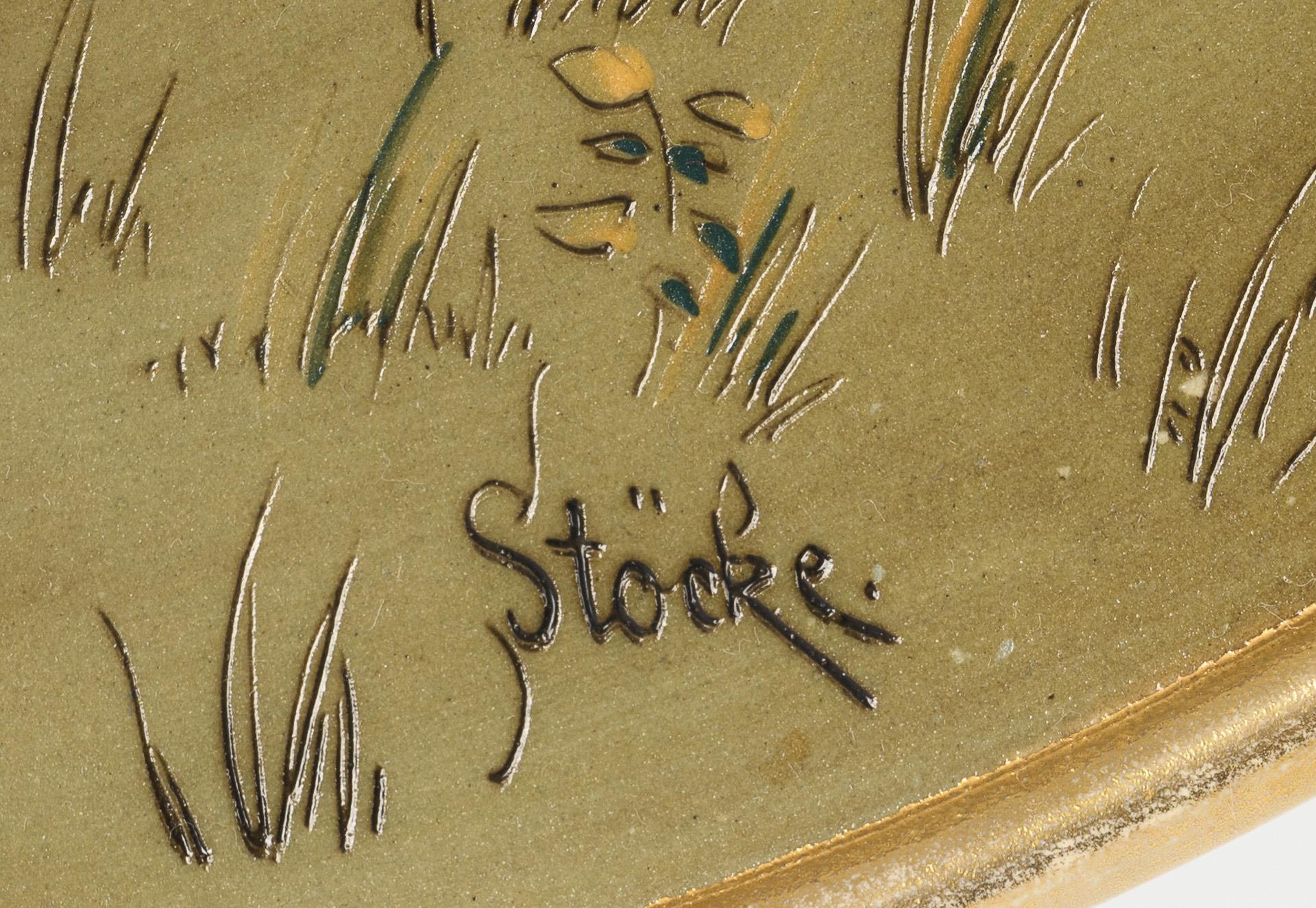 Geprägte Turmmarke "Mettlach" mit Zusatz "Gegen Nachbildung geschützt", ab 1887. Um 1900. Rechts unten signiert "Stöcke". Modell-Nr. 2147.
