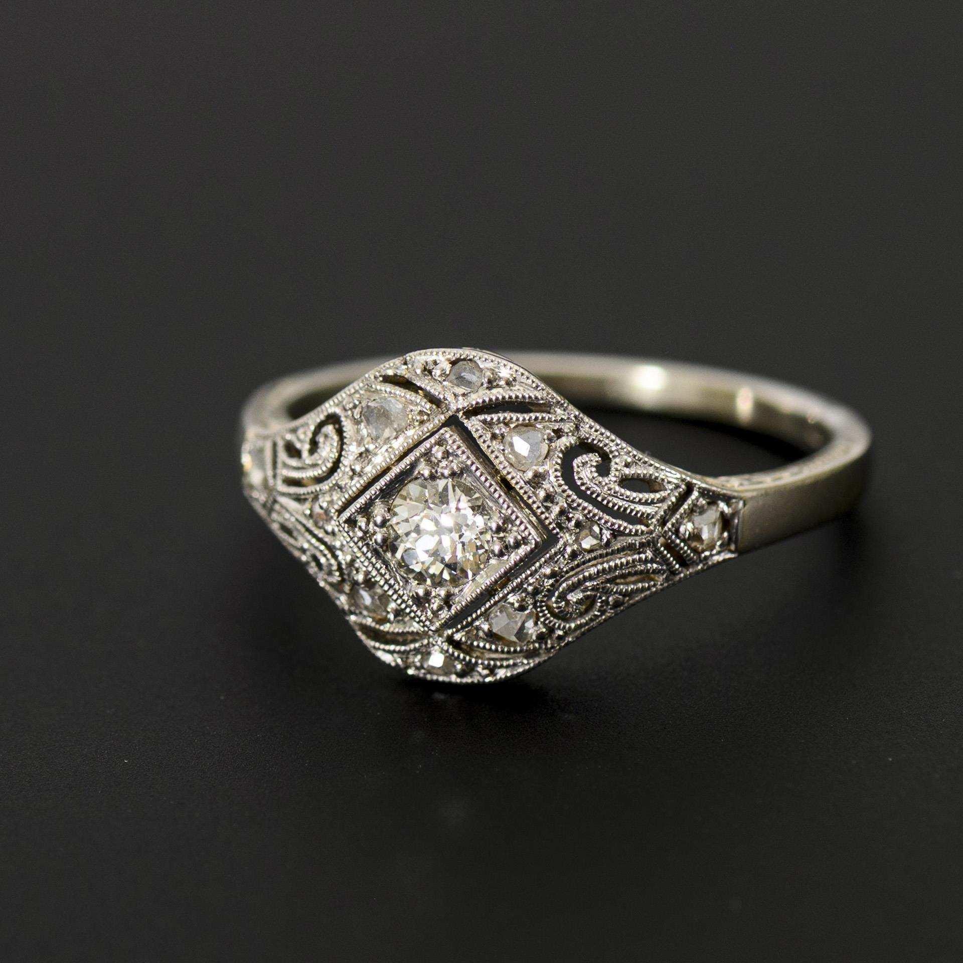 Art déco-Ring mit Brillant und kleinen Diamanten.