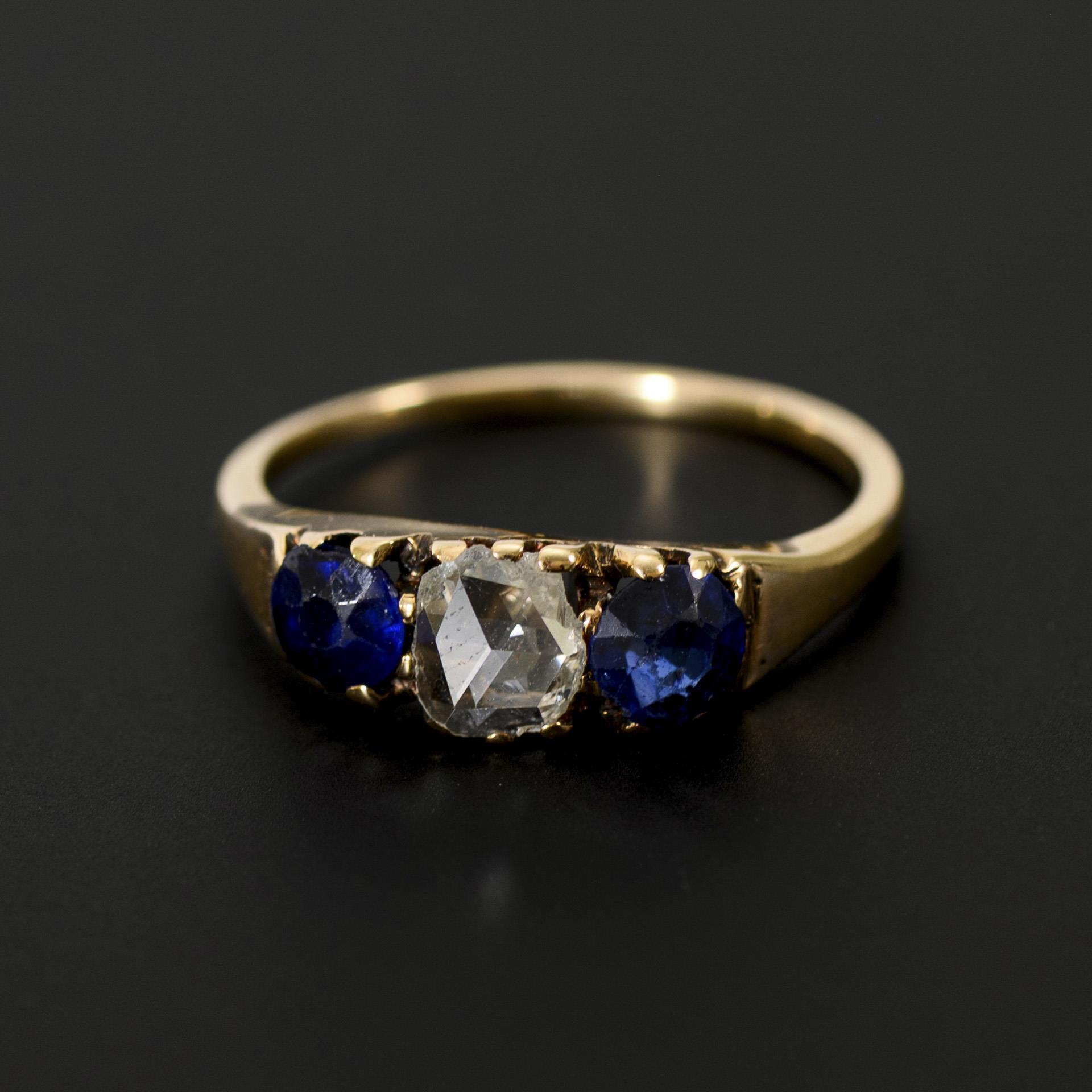 Eleganter Ring mit Trilogie-Besatz aus 2 blauen Farbsteinen, evtl. Saphiren, und einem Diamanten im Rosenschliff. Den Gesamteindruck nicht beeinträchtigte Chips und Bereibungen der Schliffkanten am Steinbesatz; 1 blauer Stein mit 2 Chips in der Tafel, Rand des Diamanten mit Chips.
