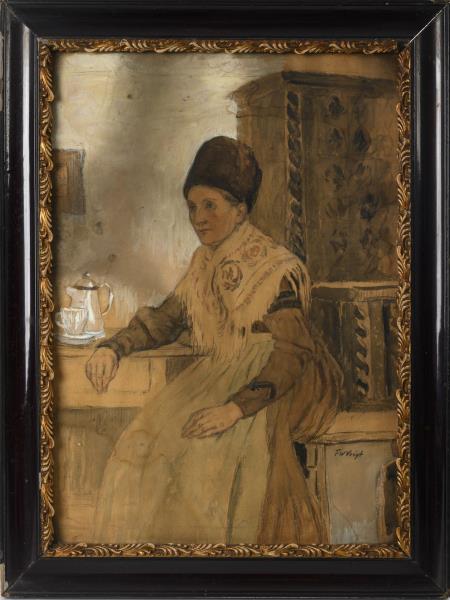 Bildnis einer jungen Frau mit gemustertem Tuch und hoher Kopfbedeckung am Tisch in der Stube. Wasserschaden.