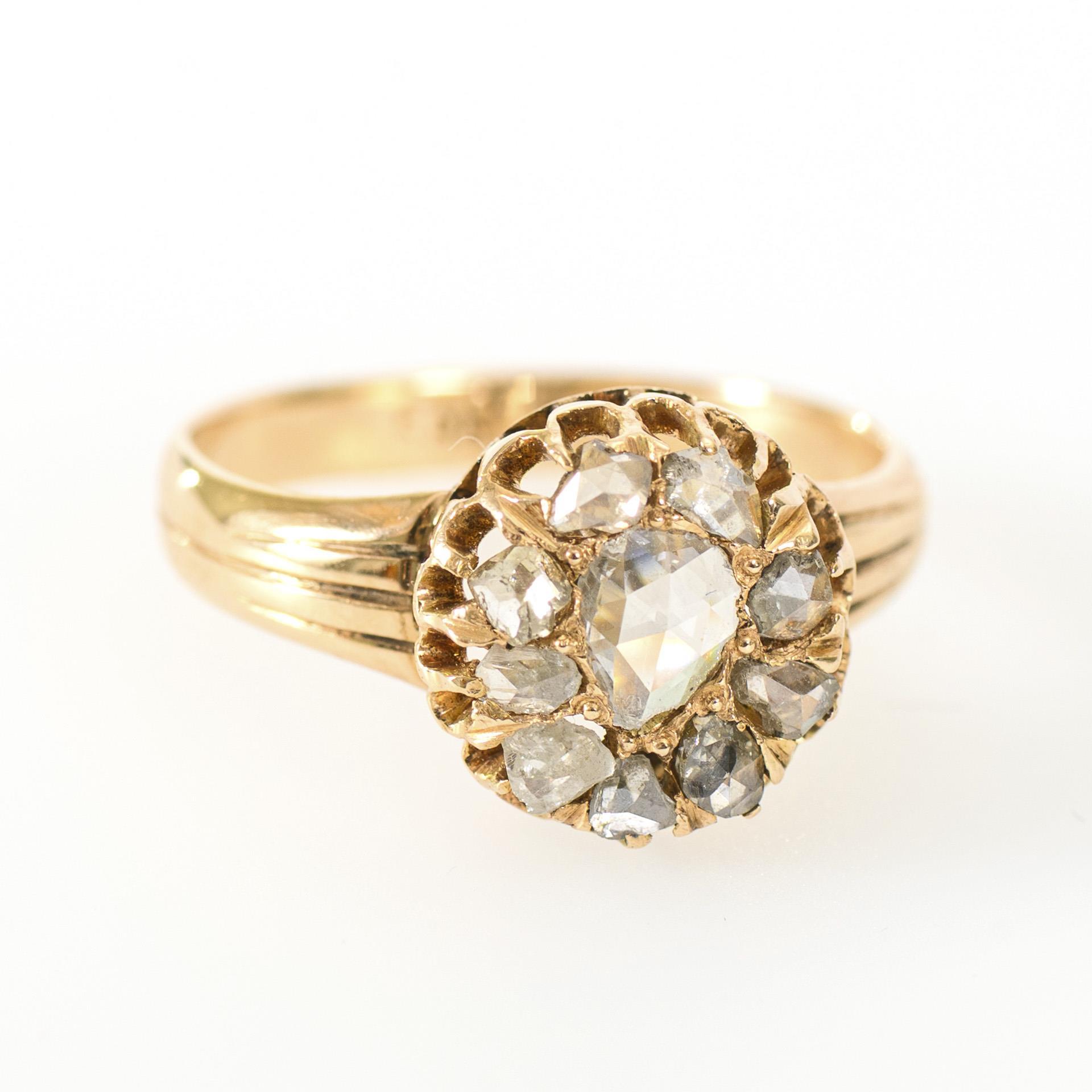 Ring in historisch anmutender Gestaltung wohl nach Vorbild vor allem iberischen Schmucks des 18. Jahrhunderts mit einer tropfenförmigen Diamantrose sowie 9 weiteren, ihre natürlichen Formen berücksichtigend geschliffenen Diamanten. Einige randseitige Diamanten mit kleinen Chips, diese nur unter zehnfacher Vergrößerung auffällig.