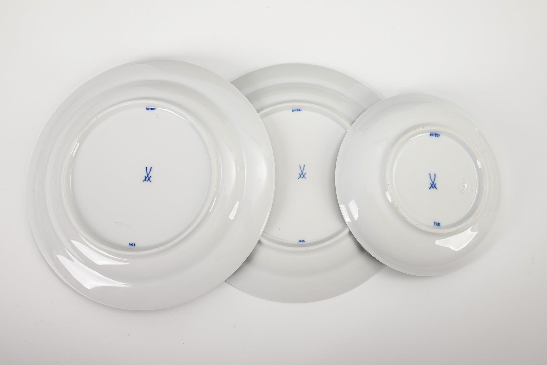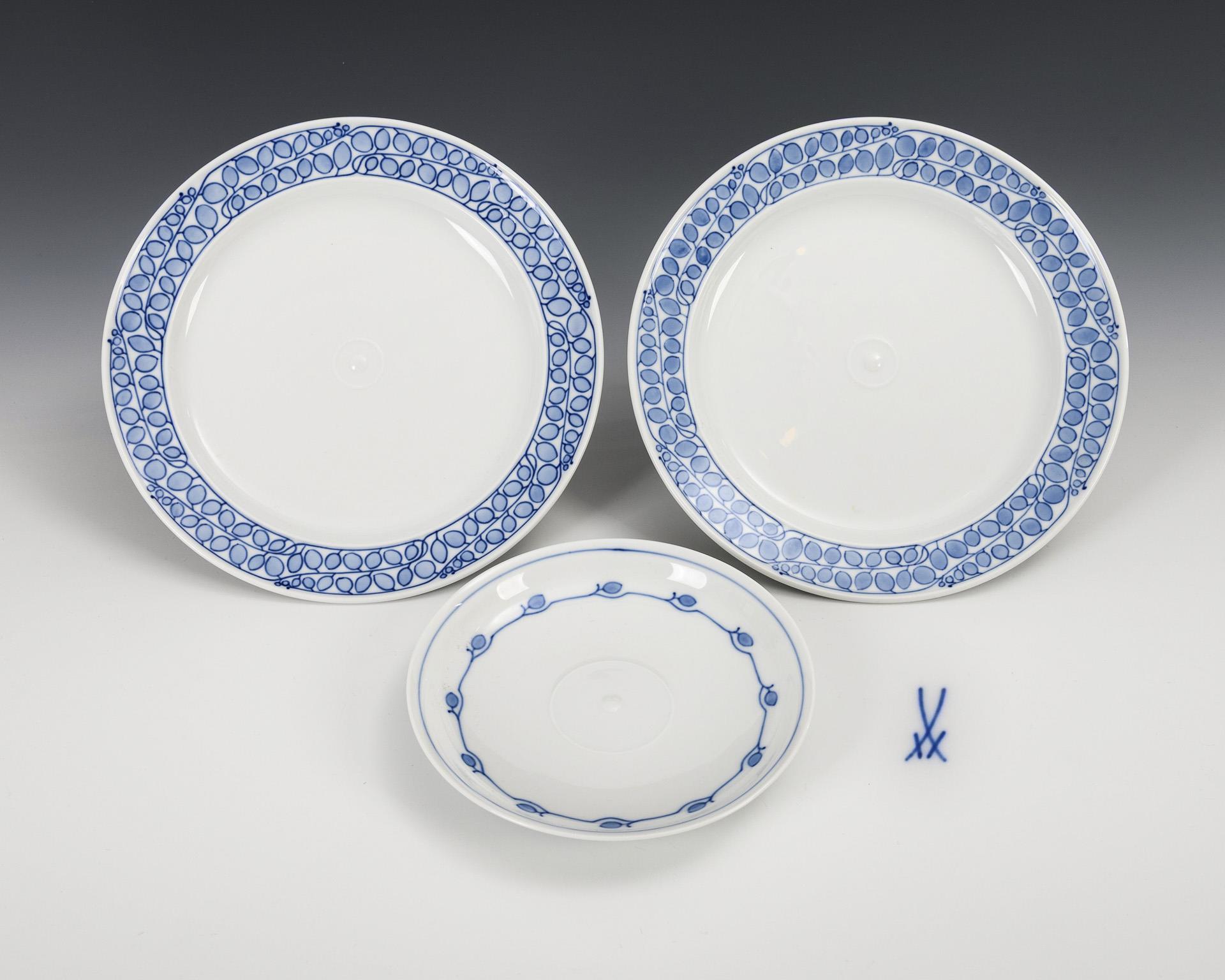 Unterglasurblau gemaltes Dekor "Blaue Rispe", Form- und Dekorentwurf Richard Riemerschmid 1903/1904. 2 Teller (Ø 21 cm), 1 Teller (Ø 15,5 cm). 890 g.