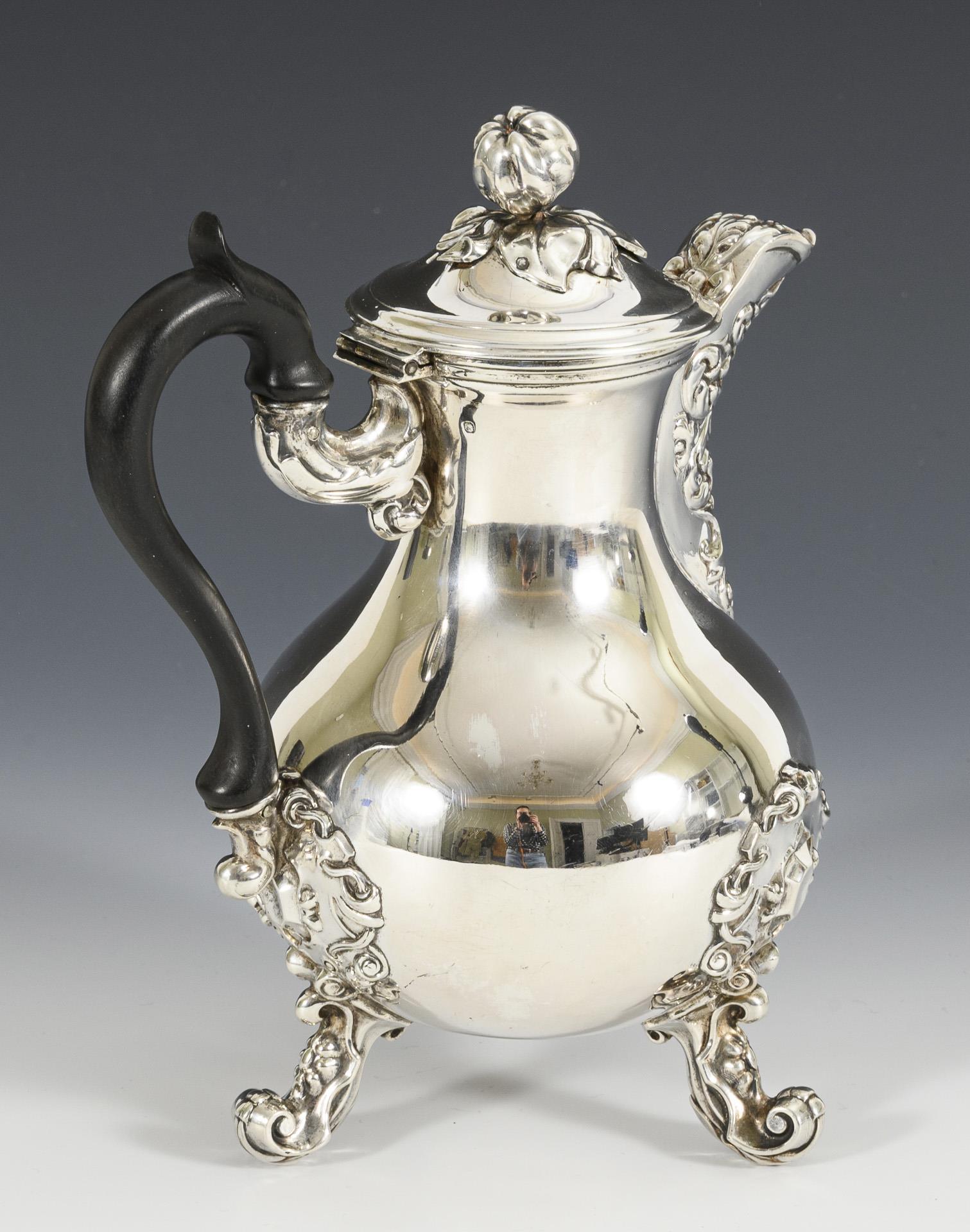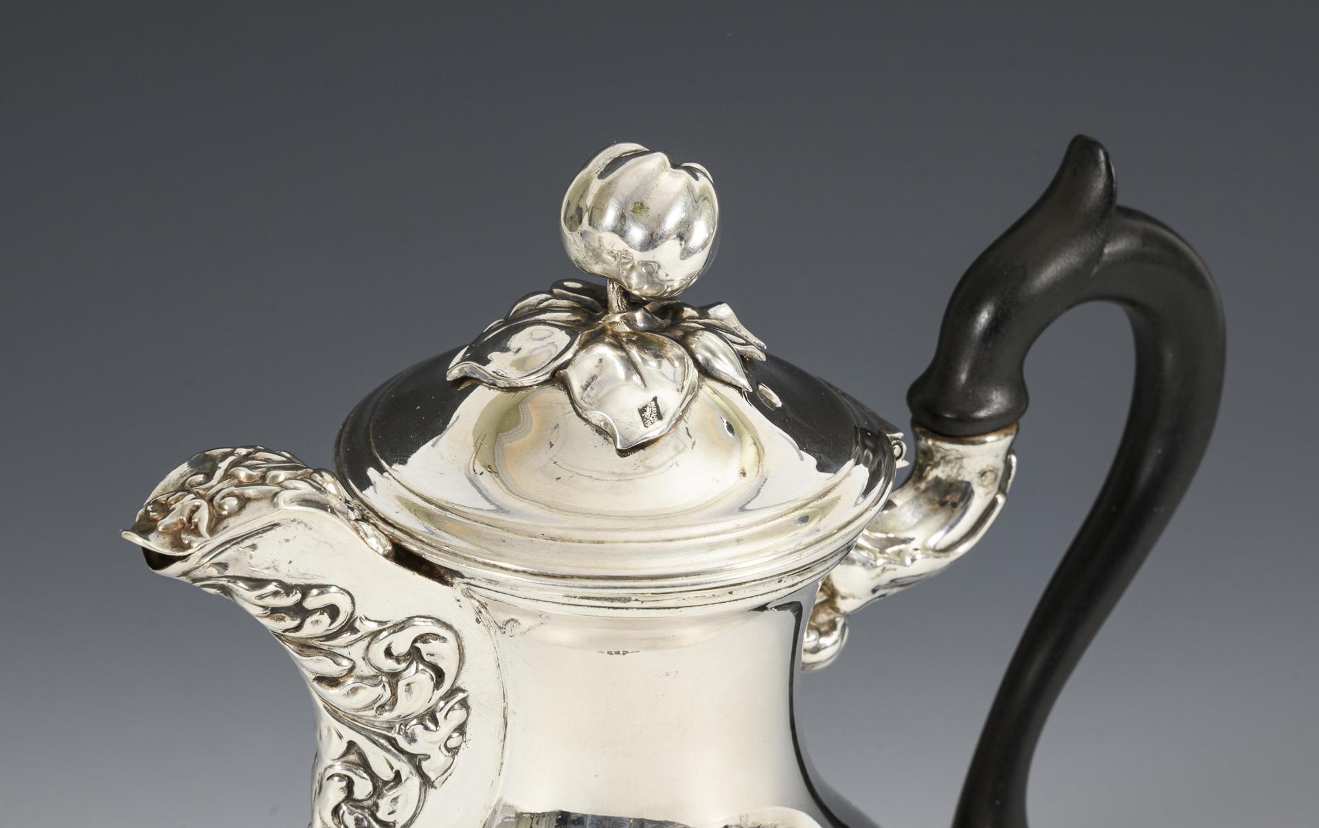 Bauchige Mokkakanne mit Rankenreliefs und ebonisiertem Holzhenkel. Auf 3 geschwungenen Füßen. Minimal gedellt, kleiner Einriss an der Schneppenabdeckung.